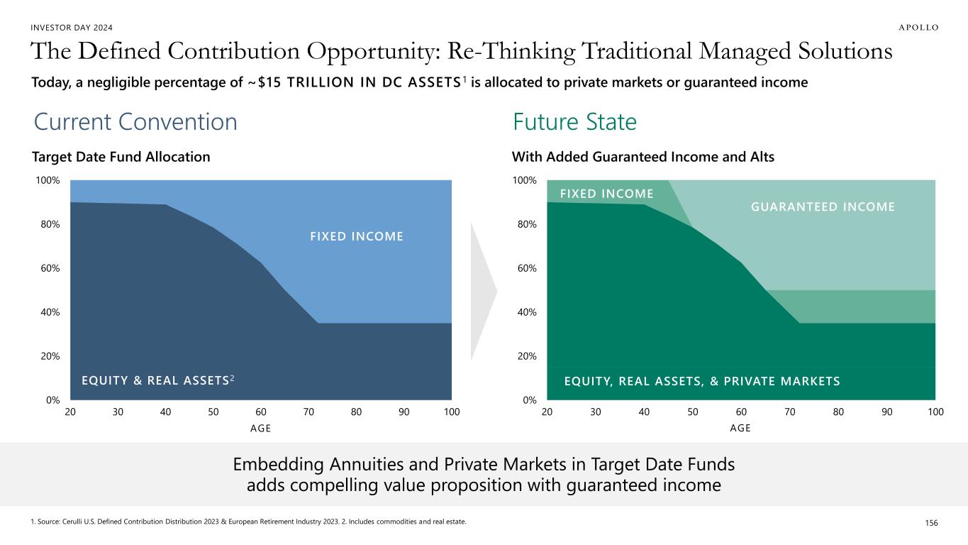 INVESTOR DAY 2024 0% 20% 40% 60% 80% 100% 20 30 40 50 60 70 80 90 100 AGE The Defined Contribution Opportunity: Re-Thinking Traditional Managed Solutions 1. Source: Cerulli U.S. Defined Contribution Distribution 2023 & European Retirement Industry 2023. 2. Includes commodities and real estate. 156 Today, a negligible percentage of ~$15 TRILLION IN DC ASSETS1 is allocated to private markets or guaranteed income 0% 20% 40% 60% 80% 100% 20 30 40 50 60 70 80 90 100 AGE FIXED INCOME EQUITY & REAL ASSETS2 Embedding Annuities and Private Markets in Target Date Funds adds compelling value proposition with guaranteed income Current Convention Target Date Fund Allocation Future State With Added Guaranteed Income and Alts GUARANTEED INCOME FIXED INCOME EQUITY, REAL ASSETS, & PRIVATE MARKETS
