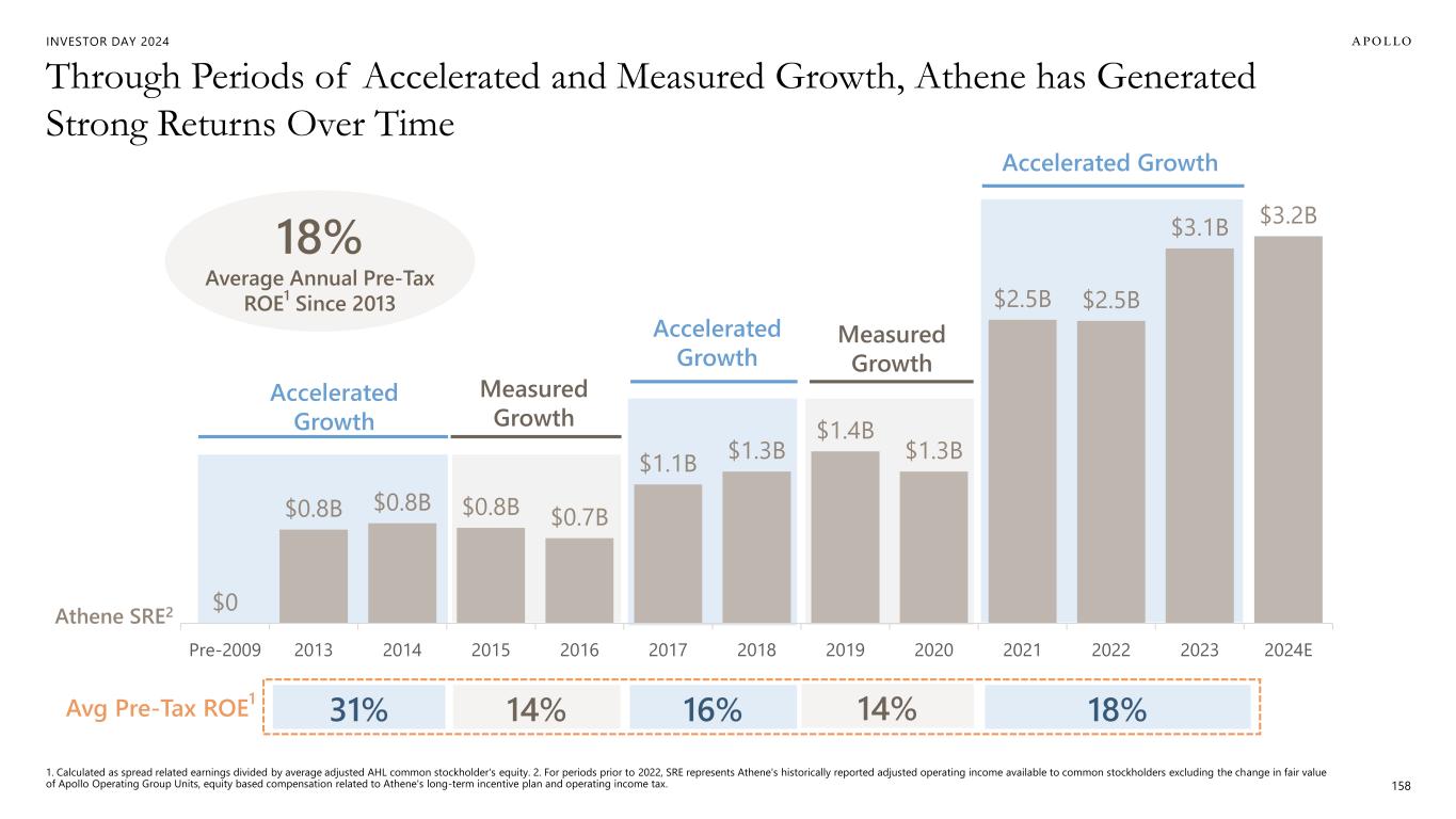 INVESTOR DAY 2024 $0 $0.8B $0.8B $0.8B $0.7B $1.1B $1.3B $1.4B $1.3B $2.5B $2.5B $3.1B $3.2B Pre-2009 2013 2014 2015 2016 2017 2018 2019 2020 2021 2022 2023 2024E Through Periods of Accelerated and Measured Growth, Athene has Generated Strong Returns Over Time Accelerated Growth Measured Growth Measured Growth Athene SRE2 Avg Pre-Tax ROE 1 14% Accelerated Growth 14% 18%16% 18% Average Annual Pre-Tax ROE 1 Since 2013 31% Accelerated Growth 158 1. Calculated as spread related earnings divided by average adjusted AHL common stockholder's equity. 2. For periods prior to 2022, SRE represents Athene's historically reported adjusted operating income available to common stockholders excluding the change in fair value of Apollo Operating Group Units, equity based compensation related to Athene's long-term incentive plan and operating income tax.