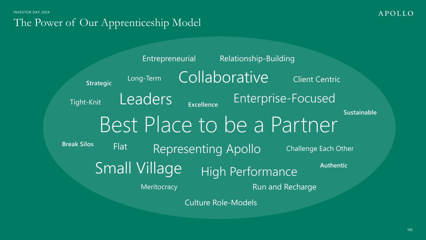 INVESTOR DAY 2024 Best Place to be a Partner Representing Apollo Leaders Small Village Flat Collaborative Tight-Knit Break Silos Strategic Long-Term Sustainable Entrepreneurial Enterprise-Focused Culture Role-Models Meritocracy Relationship-Building High Performance Client Centric Challenge Each Other Authentic Run and Recharge Excellence The Power of Our Apprenticeship Model 165