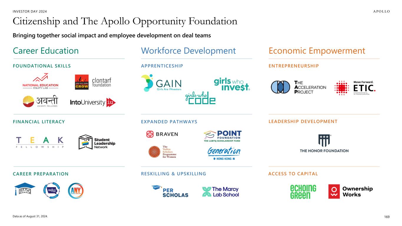 INVESTOR DAY 2024 Citizenship and The Apollo Opportunity Foundation Bringing together social impact and employee development on deal teams Data as of August 31, 2024. 169 FOUNDATIONAL SKILLS APPRENTICESHIP ENTREPRENEURSHIP FINANCIAL LITERACY EXPANDED PATHWAYS LEADERSHIP DEVELOPMENT RESKILLING & UPSKILLING ACCESS TO CAPITALCAREER PREPARATION Career Education Workforce Development Economic Empowerment