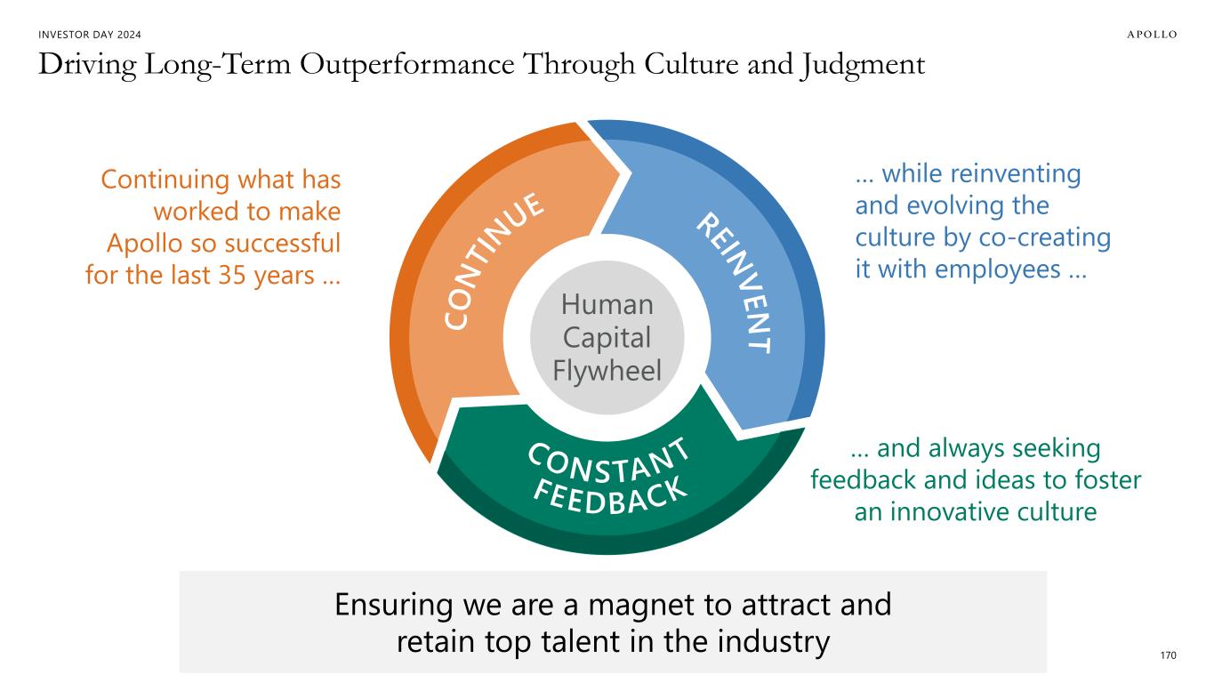 INVESTOR DAY 2024 Driving Long-Term Outperformance Through Culture and Judgment 170 Continuing what has worked to make Apollo so successful for the last 35 years … … while reinventing and evolving the culture by co-creating it with employees … … and always seeking feedback and ideas to foster an innovative culture Human Capital Flywheel Ensuring we are a magnet to attract and retain top talent in the industry