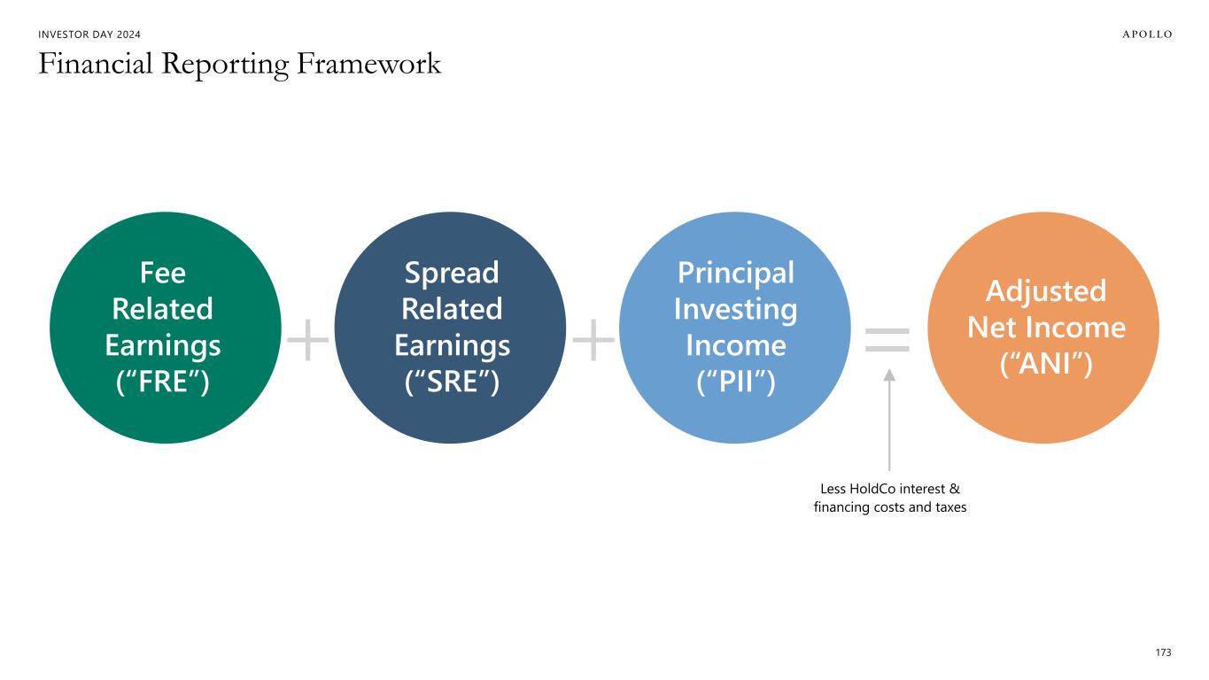 INVESTOR DAY 2024 Financial Reporting Framework 173 Fee Related Earnings (“FRE”) Spread Related Earnings (“SRE”) Principal Investing Income (“PII”) Adjusted Net Income (“ANI”) Less HoldCo interest & financing costs and taxes
