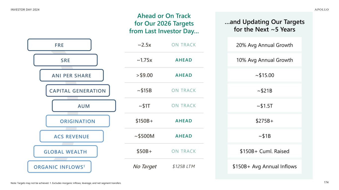 INVESTOR DAY 2024 Ahead or On Track for Our 2026 Targets from Last Investor Day… …and Updating Our Targets for the Next ~5 Years SRE FRE CAPITAL GENERATION AUM GLOBAL WEALTH ACS REVENUE ORGANIC INFLOWS 1 ORIGINATION 174 ~2.5x ON TRACK ~1.75x AHEAD >$9.00 AHEAD ~$15B ON TRACK ~$1T ON TRACK $150B+ AHEAD ~$500M AHEAD $50B+ ON TRACK No Target $125B LTM 20% Avg Annual Growth 10% Avg Annual Growth ~$15.00 ~$21B ~$1.5T $275B+ ~$1B $150B+ Cuml. Raised $150B+ Avg Annual Inflows Note: Targets may not be achieved. 1. Excludes inorganic inflows, leverage, and net segment transfers. ANI PER SHARE