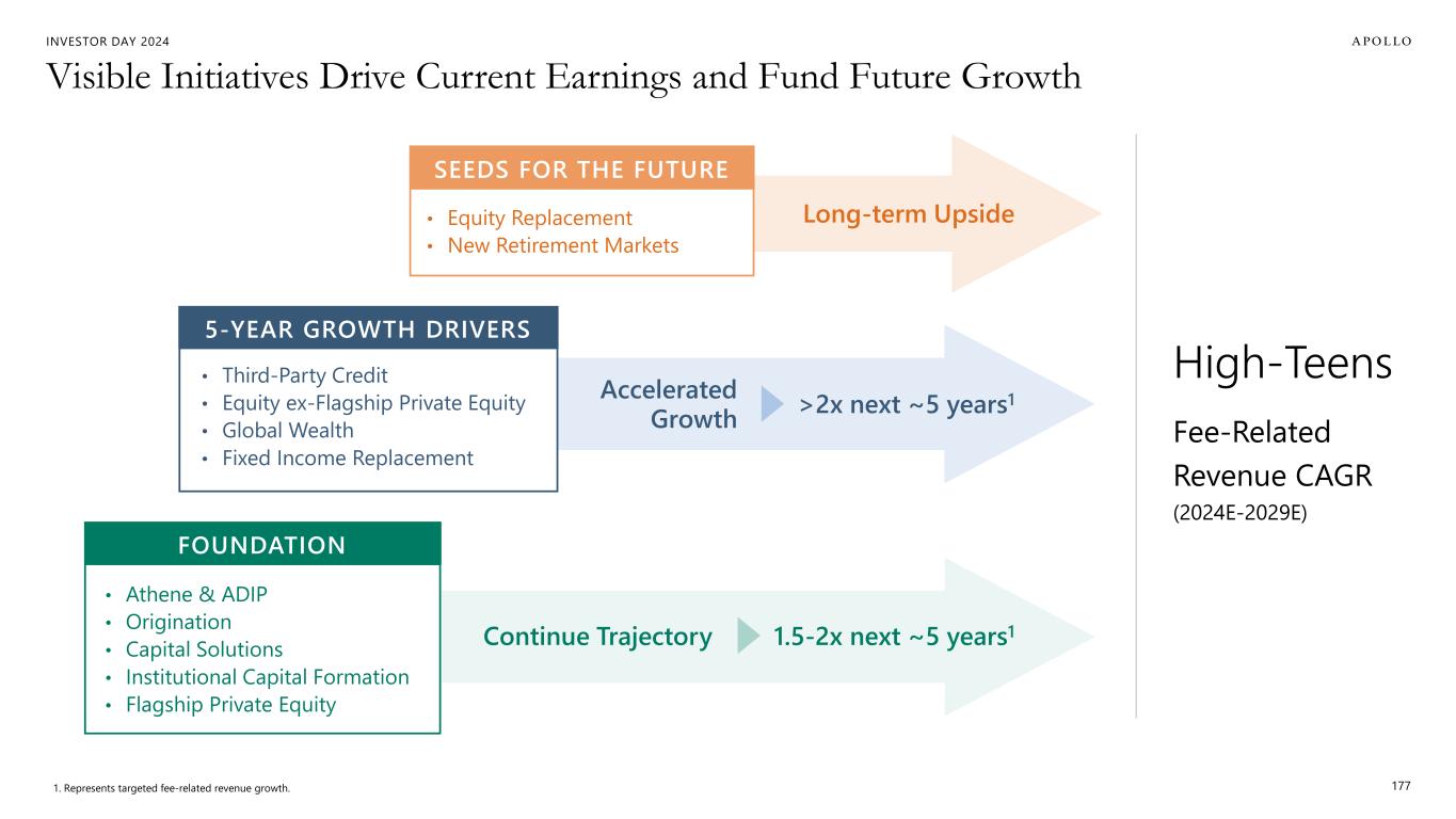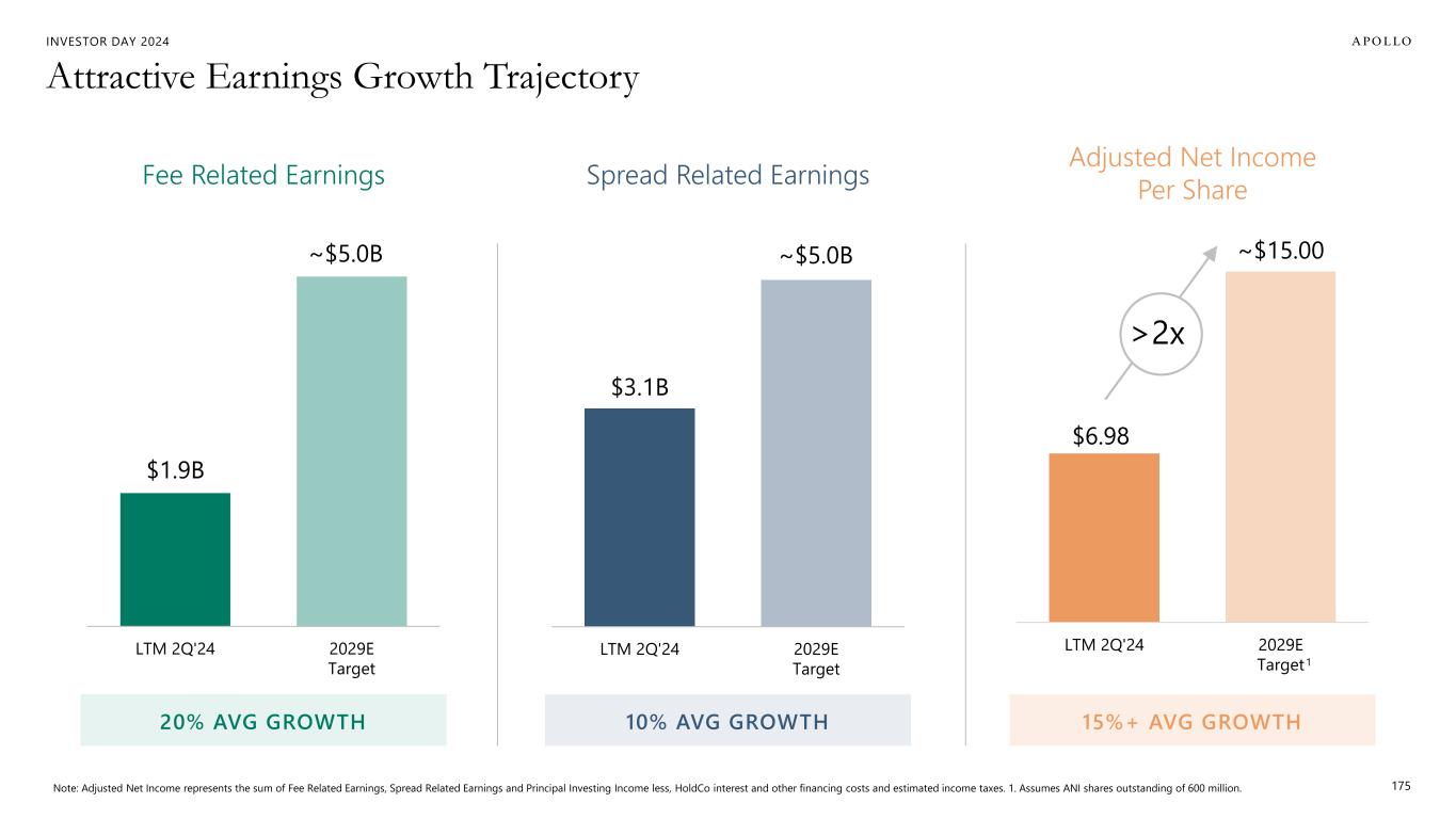 INVESTOR DAY 2024 Attractive Earnings Growth Trajectory 175Note: Adjusted Net Income represents the sum of Fee Related Earnings, Spread Related Earnings and Principal Investing Income less, HoldCo interest and other financing costs and estimated income taxes. 1. Assumes ANI shares outstanding of 600 million. $1.9B ~$5.0B LTM 2Q'24 2029E Target Fee Related Earnings 20% AVG GROWTH $3.1B ~$5.0B LTM 2Q'24 2029E Target Spread Related Earnings 10% AVG GROWTH $6.98 ~$15.00 LTM 2Q'24 2029E Target Adjusted Net Income Per Share 15%+ AVG GROWTH 1 >2x