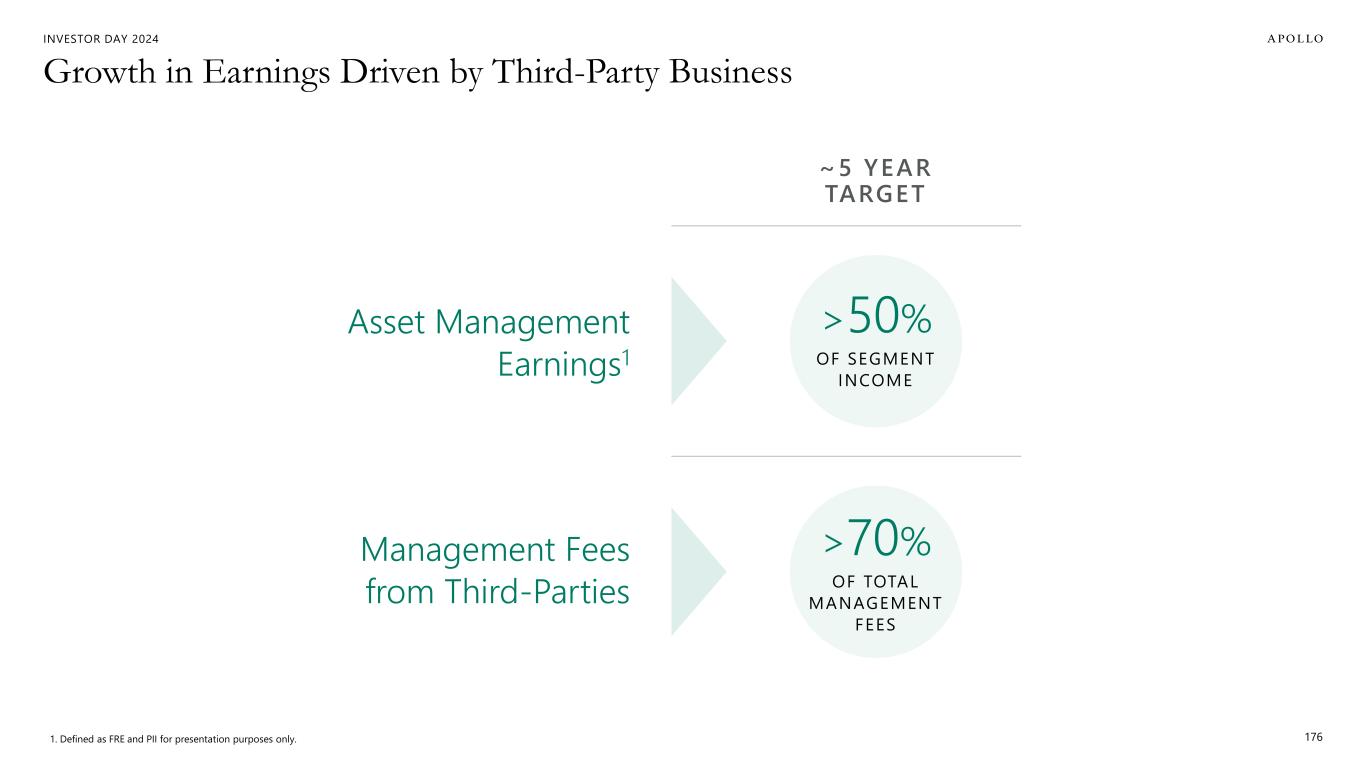 INVESTOR DAY 2024 Growth in Earnings Driven by Third-Party Business 176 ~5 YEAR TARGET Asset Management Earnings1 Management Fees from Third-Parties >50% OF SEGMENT INCOME >70% OF TOTAL MANAGEMENT FEES 1. Defined as FRE and PII for presentation purposes only.