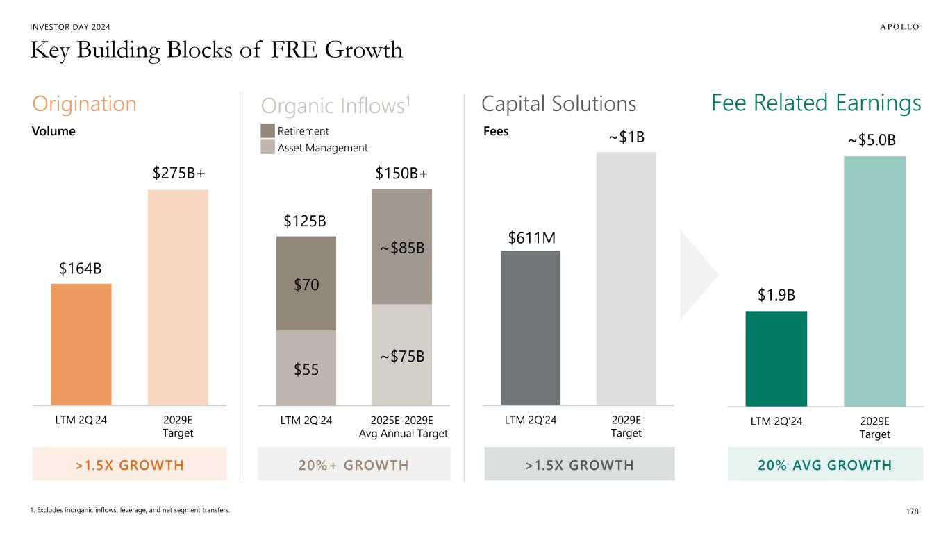 INVESTOR DAY 2024 $55 ~$75B $70 ~$85B LTM 2Q'24 2025E-2029E Avg Annual Target $611M ~$1B LTM 2Q'24 2029E Target Key Building Blocks of FRE Growth 178 Capital SolutionsOrganic Inflows1 20%+ GROWTH >1.5X GROWTH $164B $275B+ LTM 2Q'24 2029E Target Origination >1.5X GROWTH Volume Fees $1.9B ~$5.0B LTM 2Q'24 2029E Target 20% AVG GROWTH Fee Related Earnings 1. Excludes inorganic inflows, leverage, and net segment transfers. Retirement Asset Management $125B $150B+