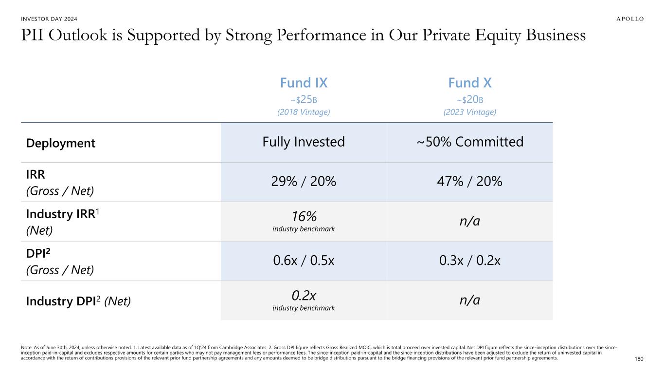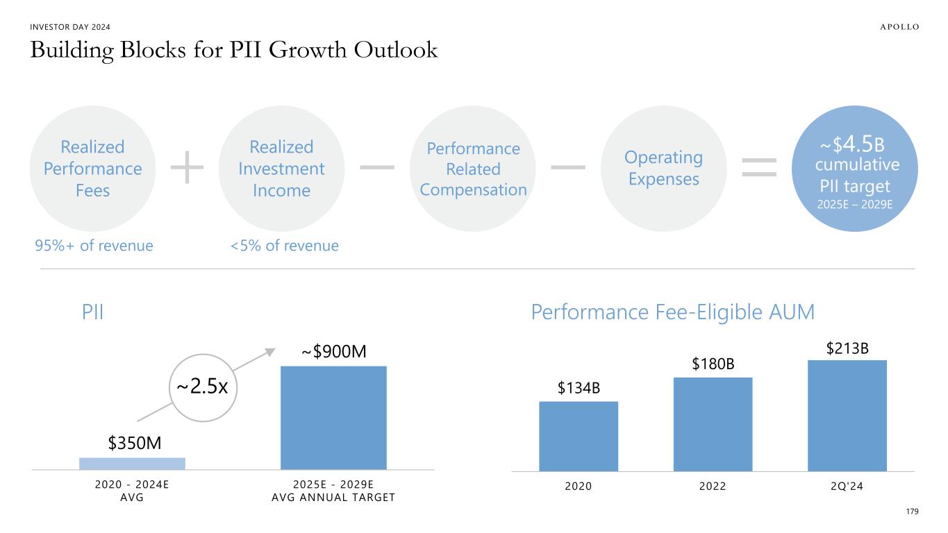 INVESTOR DAY 2024 $350M ~$900M 2020 - 2024E AVG 2025E - 2029E AVG ANNUAL TARGET PII Building Blocks for PII Growth Outlook 179 Realized Performance Fees Realized Investment Income Performance Related Compensation Operating Expenses Performance Fee-Eligible AUM $134B $180B $213B 2020 2022 2Q'24 ~2.5x cumulative PII target 2025E – 2029E ~$4.5B 95%+ of revenue <5% of revenue