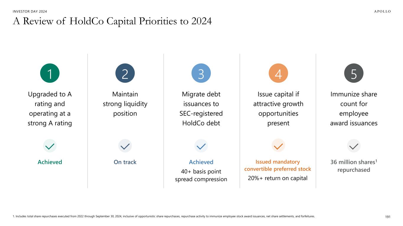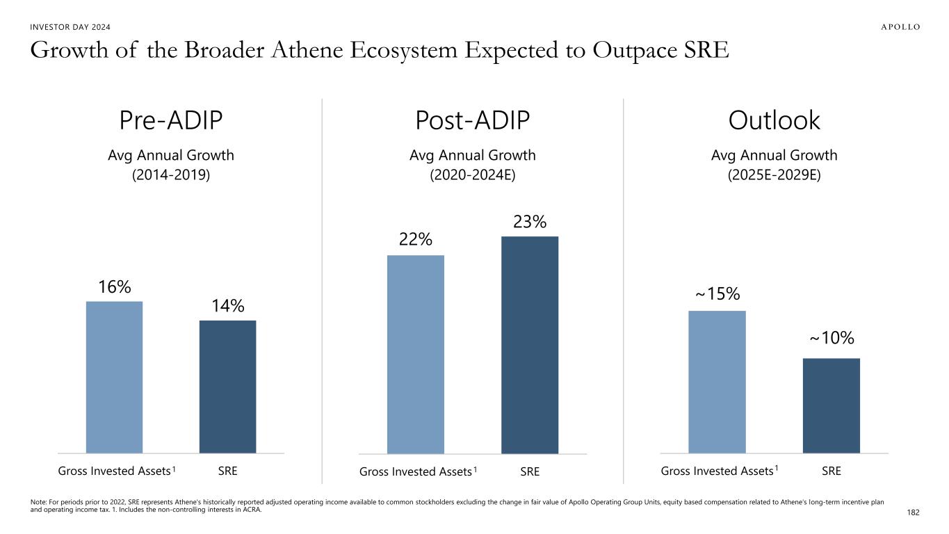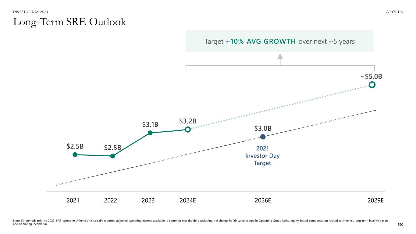 INVESTOR DAY 2024 $2.5B $2.5B $3.1B $3.2B $3.0B 2021A 2022A 2023A 2024E 2025E 2026E 2027E 2028E 2029E Long-Term SRE Outlook Note: For periods prior to 2022, SRE represents Athene's historically reported adjusted operating income available to common stockholders excluding the change in fair value of Apollo Operating Group Units, equity-based compensation related to Athene's long-term incentive plan and operating income tax. 190 2021 Investor Day Target Target ~10% AVG GROWTH over next ~5 years ~$5.0B
