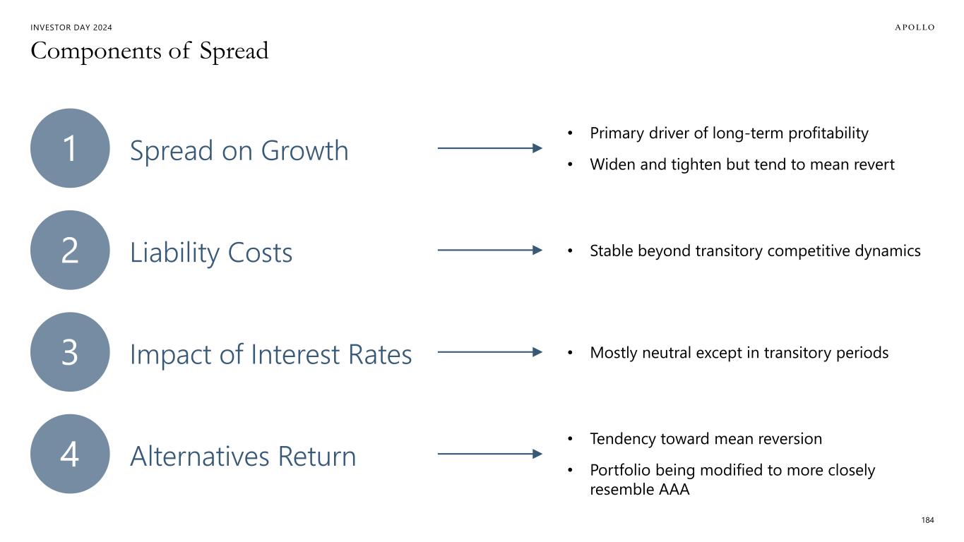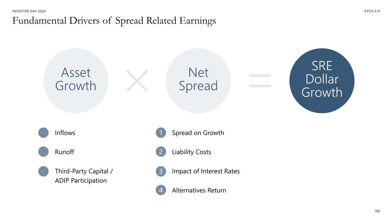 INVESTOR DAY 2024 Fundamental Drivers of Spread Related Earnings 183 Asset Growth Net Spread SRE Dollar Growth Inflows Runoff Third-Party Capital / ADIP Participation Spread on Growth Liability Costs Impact of Interest Rates Alternatives Return 1 2 3 4
