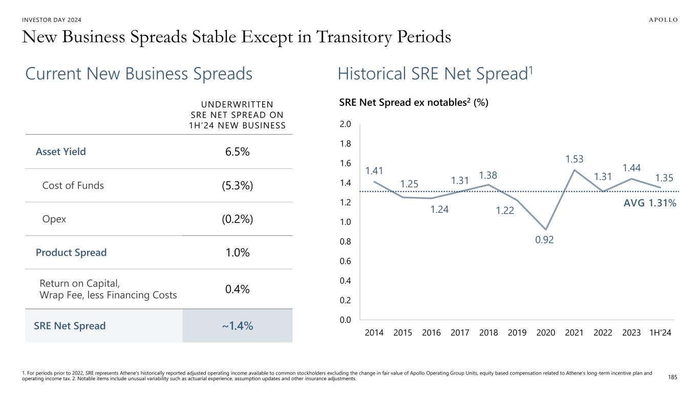 INVESTOR DAY 2024 New Business Spreads Stable Except in Transitory Periods 185 UNDERWRITTEN SRE NET SPREAD ON 1H’24 NEW BUSINESS Asset Yield 6.5% Cost of Funds (5.3%) Opex (0.2%) Product Spread 1.0% Return on Capital, Wrap Fee, less Financing Costs 0.4% SRE Net Spread ~1.4% Current New Business Spreads Historical SRE Net Spread1 1.41 1.25 1.24 1.31 1.38 1.22 0.92 1.53 1.31 1.44 1.35 0.0 0.2 0.4 0.6 0.8 1.0 1.2 1.4 1.6 1.8 2.0 2014 2015 2016 2017 2018 2019 2020 2021 2022 2023 1H'24 AVG 1.31% SRE Net Spread ex notables2 (%) 1. For periods prior to 2022, SRE represents Athene's historically reported adjusted operating income available to common stockholders excluding the change in fair value of Apollo Operating Group Units, equity based compensation related to Athene's long-term incentive plan and operating income tax. 2. Notable items include unusual variability such as actuarial experience, assumption updates and other insurance adjustments.