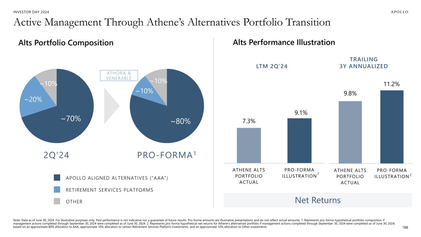 INVESTOR DAY 2024 9.8% 11.2% ATHENE ALTS PORTFOLIO ACTUAL PRO-FORMA ILLUSTRATION Active Management Through Athene’s Alternatives Portfolio Transition 188 Alts Portfolio Composition ~70% ~20% ~10% ~80% ~10% ~10% 2Q’24 PRO-FORMA1 APOLLO ALIGNED ALTERNATIVES (“AAA”) RETIREMENT SERVICES PLATFORMS OTHER Alts Performance Illustration Net Returns LTM 2Q’24 TRAILING 3Y ANNUALIZED Note: Data as of June 30, 2024. For illustrative purposes only. Past performance is not indicative nor a guarantee of future results. Pro-forma amounts are illustrative presentations and do not reflect actual amounts. 1. Represents pro-forma hypothetical portfolio composition if management actions completed through September 30, 2024 were completed as of June 30, 2024. 2. Represents pro-forma hypothetical net returns for Athene’s alternatives portfolio if management actions completed through September 30, 2024 were completed as of June 30, 2024, based on an approximate 80% allocation to AAA, approximate 10% allocation to certain Retirement Services Platform investments, and an approximate 10% allocation to Other investments. 7.3% 9.1% ATHENE ALTS PORTFOLIO ACTUAL PRO-FORMA ILLUSTRATION 2 2 ATHORA & VENERABLE