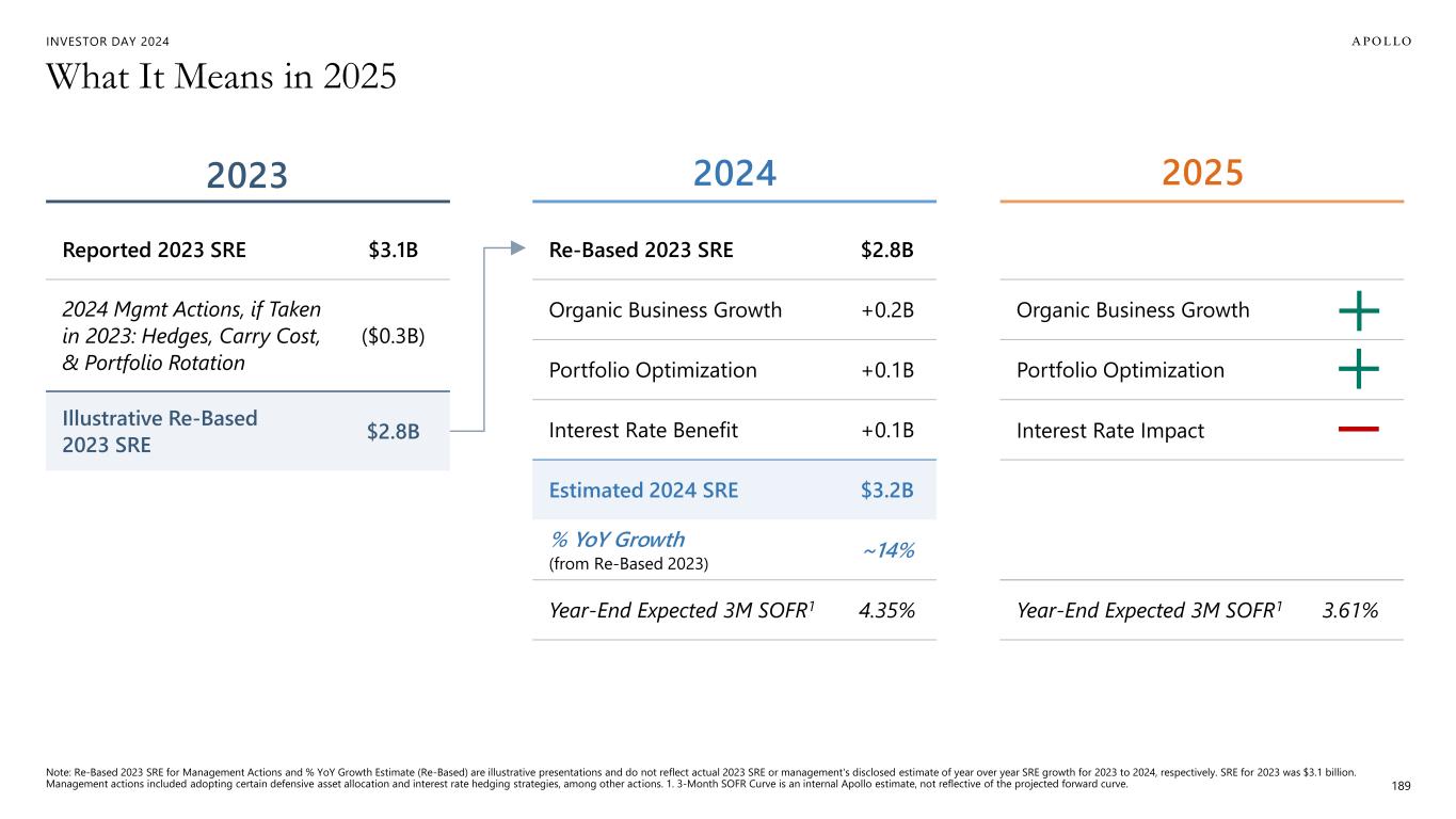 INVESTOR DAY 2024 Organic Business Growth Portfolio Optimization Interest Rate Impact Year-End Expected 3M SOFR1 3.61% What It Means in 2025 189 2023 Reported 2023 SRE $3.1B 2024 Mgmt Actions, if Taken in 2023: Hedges, Carry Cost, & Portfolio Rotation ($0.3B) Illustrative Re-Based 2023 SRE $2.8B 2024 Re-Based 2023 SRE $2.8B Organic Business Growth +0.2B Portfolio Optimization +0.1B Interest Rate Benefit +0.1B Estimated 2024 SRE $3.2B % YoY Growth (from Re-Based 2023) ~14% Year-End Expected 3M SOFR1 4.35% 2025 Note: Re-Based 2023 SRE for Management Actions and % YoY Growth Estimate (Re-Based) are illustrative presentations and do not reflect actual 2023 SRE or management's disclosed estimate of year over year SRE growth for 2023 to 2024, respectively. SRE for 2023 was $3.1 billion. Management actions included adopting certain defensive asset allocation and interest rate hedging strategies, among other actions. 1. 3-Month SOFR Curve is an internal Apollo estimate, not reflective of the projected forward curve.