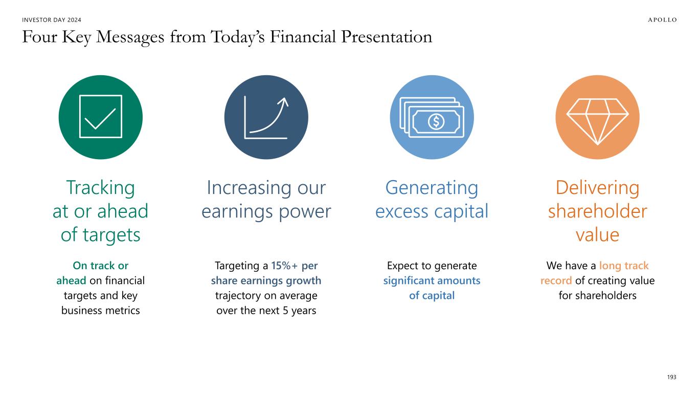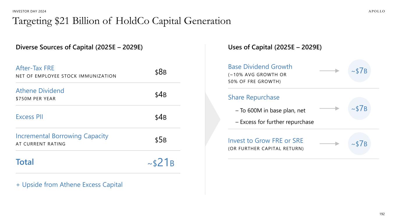 INVESTOR DAY 2024 Targeting $21 Billion of HoldCo Capital Generation 192 Base Dividend Growth (~10% AVG GROWTH OR 50% OF FRE GROWTH) Share Repurchase – To 600M in base plan, net – Excess for further repurchase Invest to Grow FRE or SRE (OR FURTHER CAPITAL RETURN) After-Tax FRE NET OF EMPLOYEE STOCK IMMUNIZATION $8B Athene Dividend $750M PER YEAR $4B Excess PII $4B Incremental Borrowing Capacity AT CURRENT RATING $5B Total ~$21B + Upside from Athene Excess Capital Diverse Sources of Capital (2025E – 2029E) Uses of Capital (2025E – 2029E) ~$7B ~$7B ~$7B