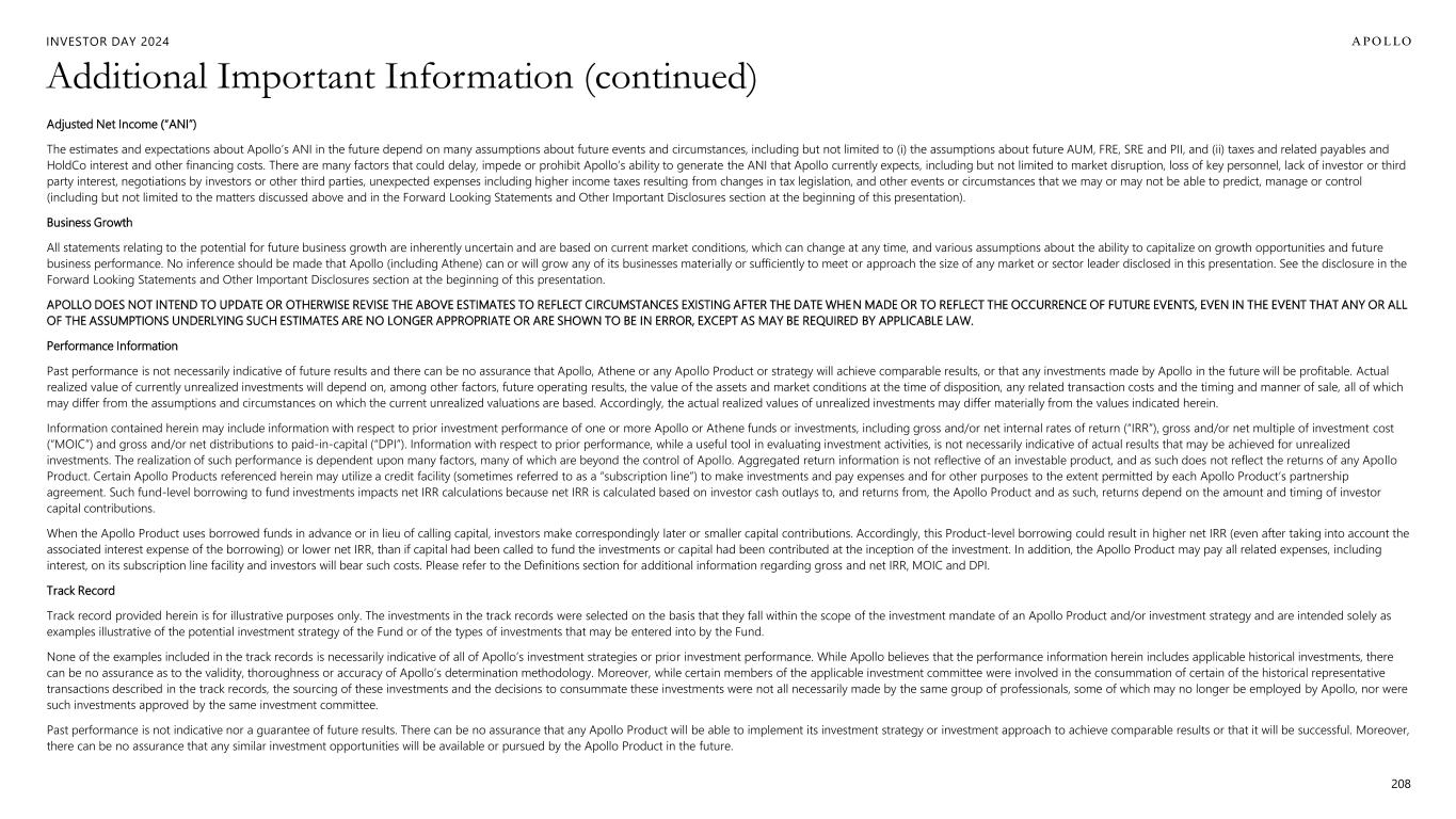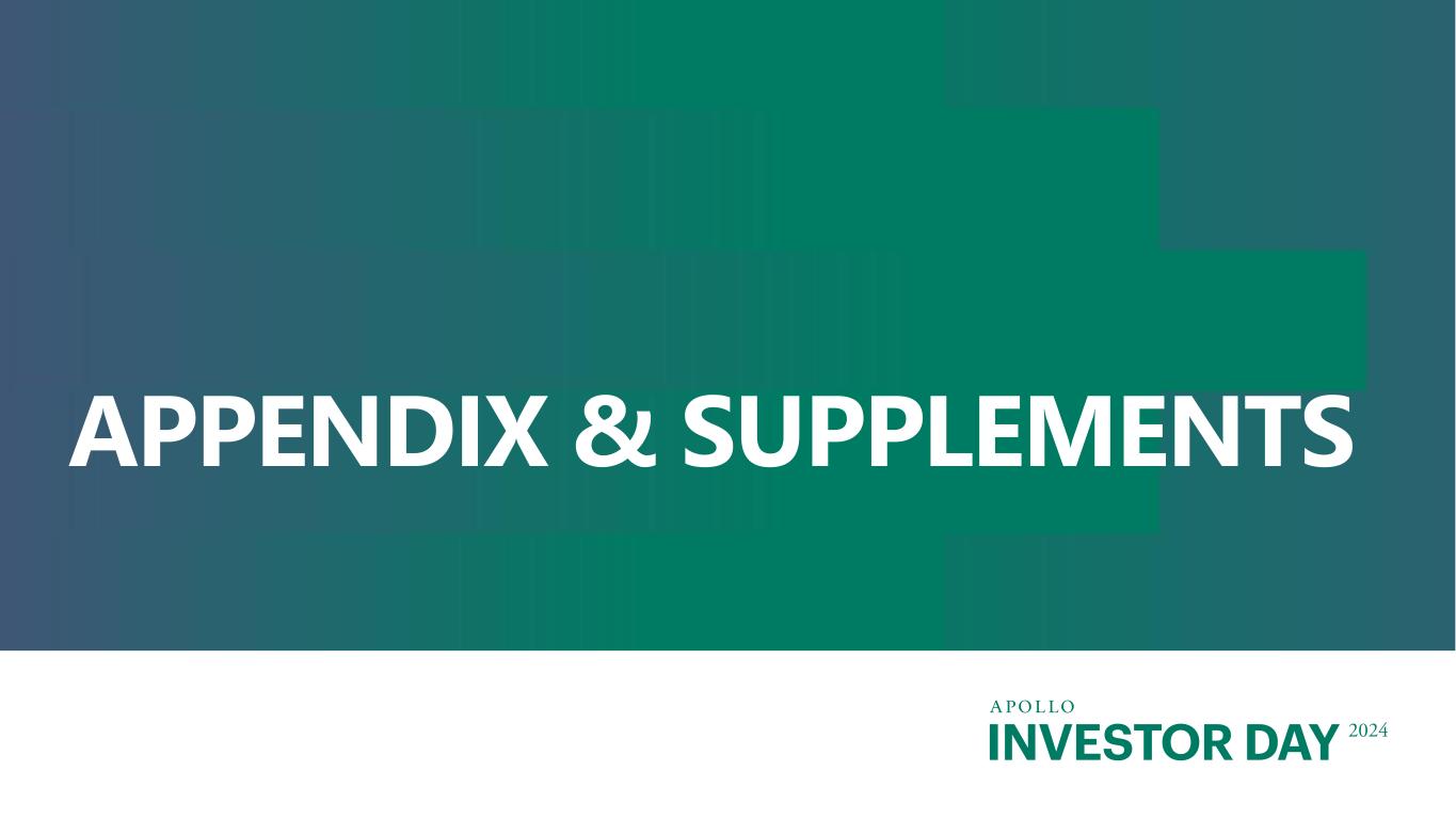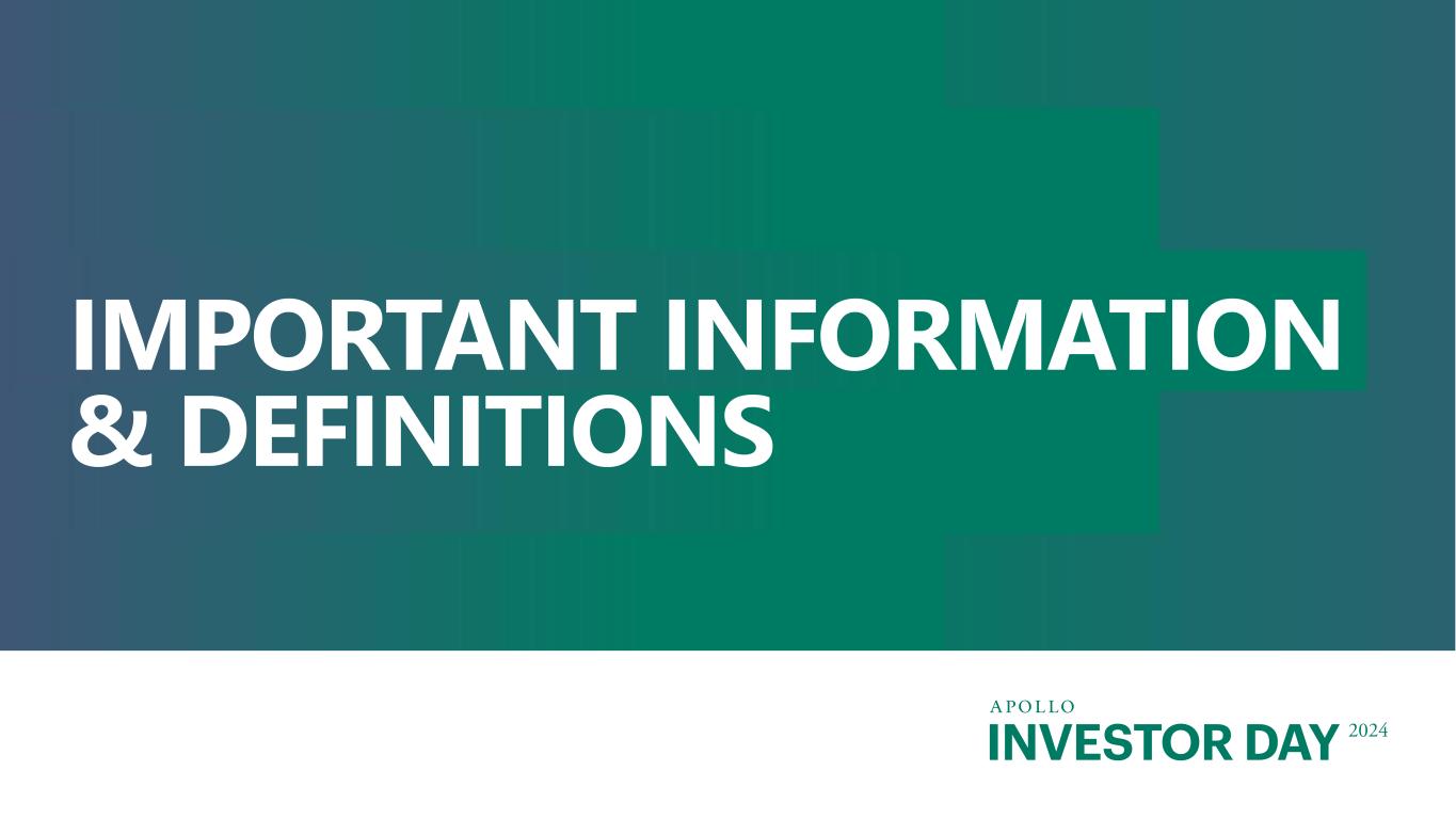 INVESTOR DAY 2024 Additional Important Information (continued) Adjusted Net Income (“ANI”) The estimates and expectations about Apollo’s ANI in the future depend on many assumptions about future events and circumstances, including but not limited to (i) the assumptions about future AUM, FRE, SRE and PII, and (ii) taxes and related payables and HoldCo interest and other financing costs. There are many factors that could delay, impede or prohibit Apollo’s ability to generate the ANI that Apollo currently expects, including but not limited to market disruption, loss of key personnel, lack of investor or third party interest, negotiations by investors or other third parties, unexpected expenses including higher income taxes resulting from changes in tax legislation, and other events or circumstances that we may or may not be able to predict, manage or control (including but not limited to the matters discussed above and in the Forward Looking Statements and Other Important Disclosures section at the beginning of this presentation). Business Growth All statements relating to the potential for future business growth are inherently uncertain and are based on current market conditions, which can change at any time, and various assumptions about the ability to capitalize on growth opportunities and future business performance. No inference should be made that Apollo (including Athene) can or will grow any of its businesses materially or sufficiently to meet or approach the size of any market or sector leader disclosed in this presentation. See the disclosure in the Forward Looking Statements and Other Important Disclosures section at the beginning of this presentation. APOLLO DOES NOT INTEND TO UPDATE OR OTHERWISE REVISE THE ABOVE ESTIMATES TO REFLECT CIRCUMSTANCES EXISTING AFTER THE DATE WHEN MADE OR TO REFLECT THE OCCURRENCE OF FUTURE EVENTS, EVEN IN THE EVENT THAT ANY OR ALL OF THE ASSUMPTIONS UNDERLYING SUCH ESTIMATES ARE NO LONGER APPROPRIATE OR ARE SHOWN TO BE IN ERROR, EXCEPT AS MAY BE REQUIRED BY APPLICABLE LAW. Performance Information Past performance is not necessarily indicative of future results and there can be no assurance that Apollo, Athene or any Apollo Product or strategy will achieve comparable results, or that any investments made by Apollo in the future will be profitable. Actual realized value of currently unrealized investments will depend on, among other factors, future operating results, the value of the assets and market conditions at the time of disposition, any related transaction costs and the timing and manner of sale, all of which may differ from the assumptions and circumstances on which the current unrealized valuations are based. Accordingly, the actual realized values of unrealized investments may differ materially from the values indicated herein. Information contained herein may include information with respect to prior investment performance of one or more Apollo or Athene funds or investments, including gross and/or net internal rates of return (“IRR”), gross and/or net multiple of investment cost (“MOIC”) and gross and/or net distributions to paid-in-capital (“DPI”). Information with respect to prior performance, while a useful tool in evaluating investment activities, is not necessarily indicative of actual results that may be achieved for unrealized investments. The realization of such performance is dependent upon many factors, many of which are beyond the control of Apollo. Aggregated return information is not reflective of an investable product, and as such does not reflect the returns of any Apollo Product. Certain Apollo Products referenced herein may utilize a credit facility (sometimes referred to as a “subscription line”) to make investments and pay expenses and for other purposes to the extent permitted by each Apollo Product’s partnership agreement. Such fund-level borrowing to fund investments impacts net IRR calculations because net IRR is calculated based on investor cash outlays to, and returns from, the Apollo Product and as such, returns depend on the amount and timing of investor capital contributions. When the Apollo Product uses borrowed funds in advance or in lieu of calling capital, investors make correspondingly later or smaller capital contributions. Accordingly, this Product-level borrowing could result in higher net IRR (even after taking into account the associated interest expense of the borrowing) or lower net IRR, than if capital had been called to fund the investments or capital had been contributed at the inception of the investment. In addition, the Apollo Product may pay all related expenses, including interest, on its subscription line facility and investors will bear such costs. Please refer to the Definitions section for additional information regarding gross and net IRR, MOIC and DPI. Track Record Track record provided herein is for illustrative purposes only. The investments in the track records were selected on the basis that they fall within the scope of the investment mandate of an Apollo Product and/or investment strategy and are intended solely as examples illustrative of the potential investment strategy of the Fund or of the types of investments that may be entered into by the Fund. None of the examples included in the track records is necessarily indicative of all of Apollo’s investment strategies or prior investment performance. While Apollo believes that the performance information herein includes applicable historical investments, there can be no assurance as to the validity, thoroughness or accuracy of Apollo’s determination methodology. Moreover, while certain members of the applicable investment committee were involved in the consummation of certain of the historical representative transactions described in the track records, the sourcing of these investments and the decisions to consummate these investments were not all necessarily made by the same group of professionals, s