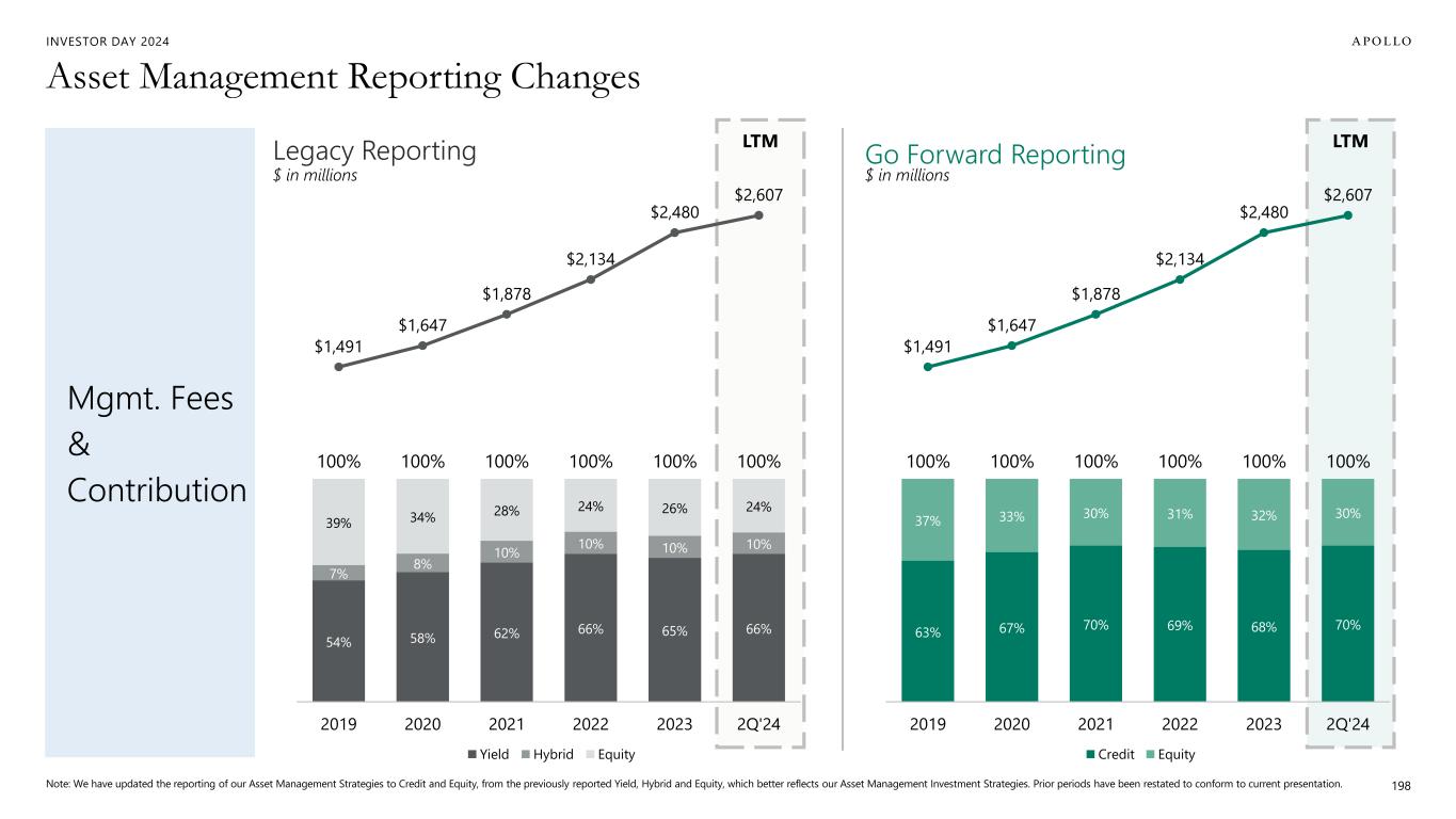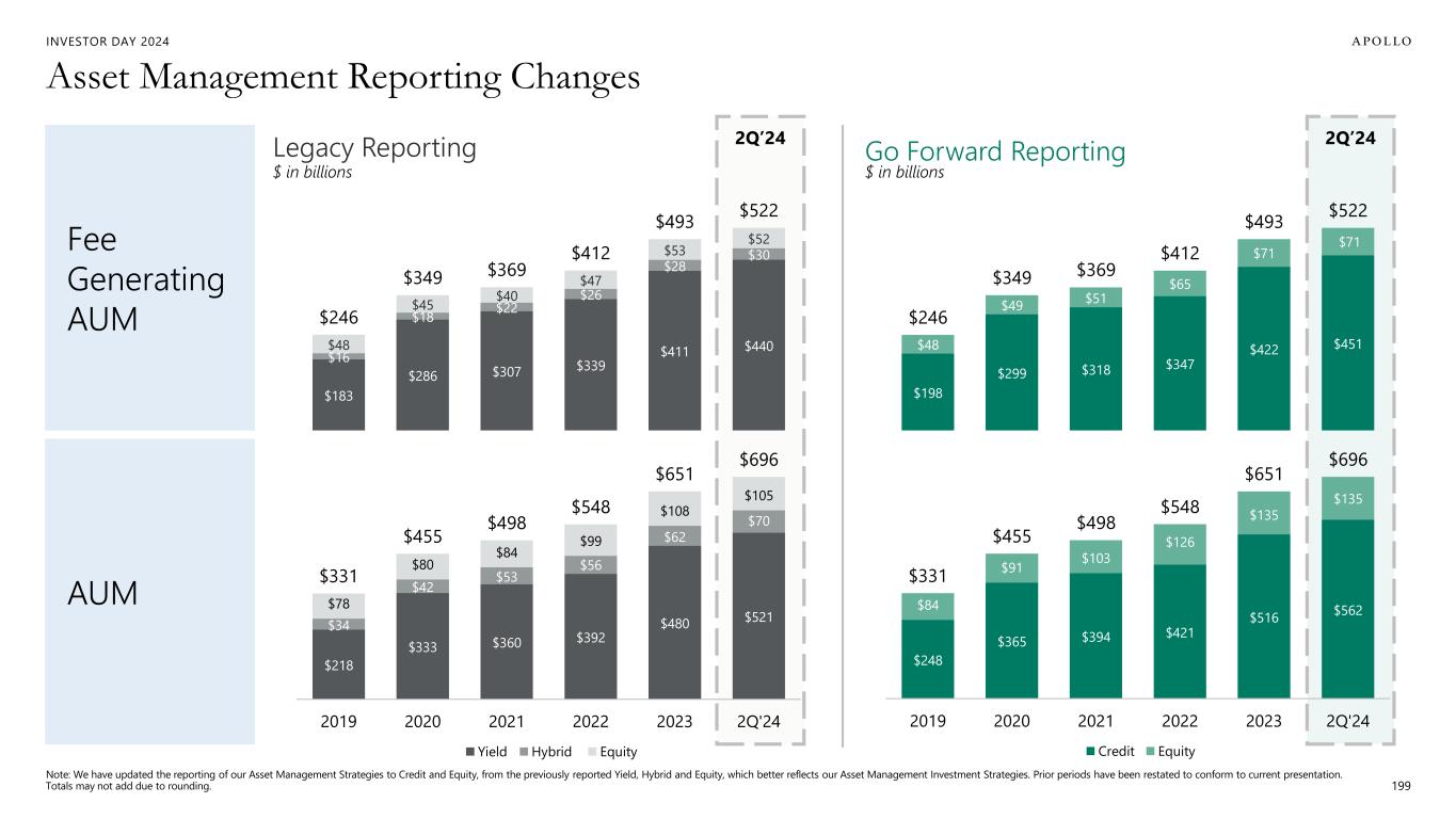 INVESTOR DAY 2024 2Q’24 2Q’24 $183 $286 $307 $339 $411 $440 $16 $18 $22 $26 $28 $30 $48 $45 $40 $47 $53 $52 $246 $349 $369 $412 $493 $522 Asset Management Reporting Changes 199 Fee Generating AUM AUM $198 $299 $318 $347 $422 $451$48 $49 $51 $65 $71 $71 $246 $349 $369 $412 $493 $522 Go Forward ReportingLegacy Reporting $ in billions $ in billions $218 $333 $360 $392 $480 $521 $34 $42 $53 $56 $62 $70 $78 $80 $84 $99 $108 $105 $331 $455 $498 $548 $651 $696 2019 2020 2021 2022 2023 2Q'24 Yield Hybrid Equity $248 $365 $394 $421 $516 $562$84 $91 $103 $126 $135 $135 $331 $455 $498 $548 $651 $696 2019 2020 2021 2022 2023 2Q'24 Credit Equity Note: We have updated the reporting of our Asset Management Strategies to Credit and Equity, from the previously reported Yield, Hybrid and Equity, which better reflects our Asset Management Investment Strategies. Prior periods have been restated to conform to current presentation. Totals may not add due to rounding.