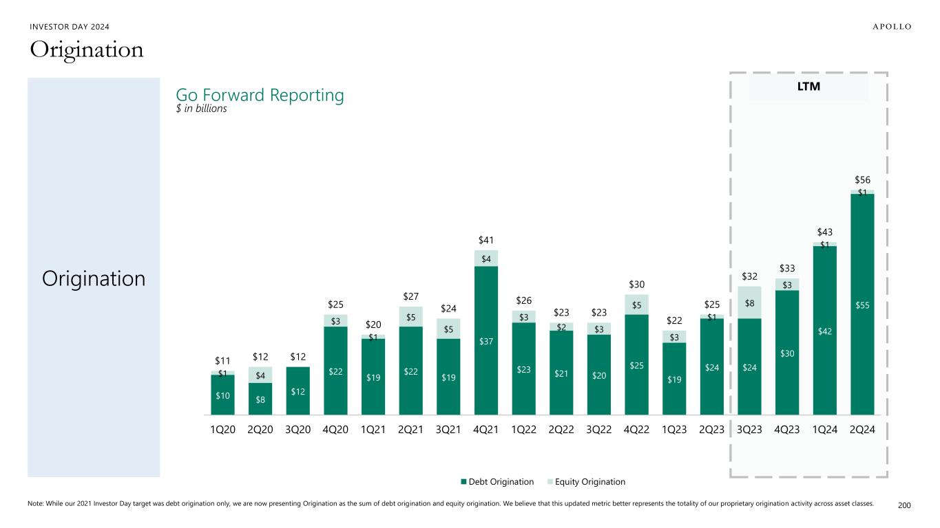 INVESTOR DAY 2024 LTM Origination 200 Origination Go Forward Reporting $ in billions $10 $8 $12 $22 $19 $22 $19 $37 $23 $21 $20 $25 $19 $24 $24 $30 $42 $55 $1 $4 $3 $1 $5 $5 $4 $3 $2 $3 $5 $3 $1 $8 $3 $1 $1 $11 $12 $12 $25 $20 $27 $24 $41 $26 $23 $23 $30 $22 $25 $32 $33 $43 $56 1Q20 2Q20 3Q20 4Q20 1Q21 2Q21 3Q21 4Q21 1Q22 2Q22 3Q22 4Q22 1Q23 2Q23 3Q23 4Q23 1Q24 2Q24 Debt Origination Equity Origination Note: While our 2021 Investor Day target was debt origination only, we are now presenting Origination as the sum of debt origination and equity origination. We believe that this updated metric better represents the totality of our proprietary origination activity across asset classes.