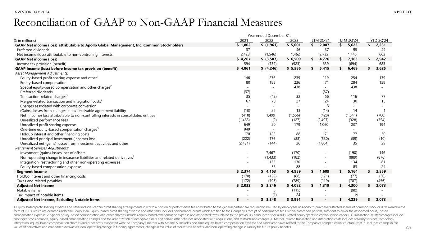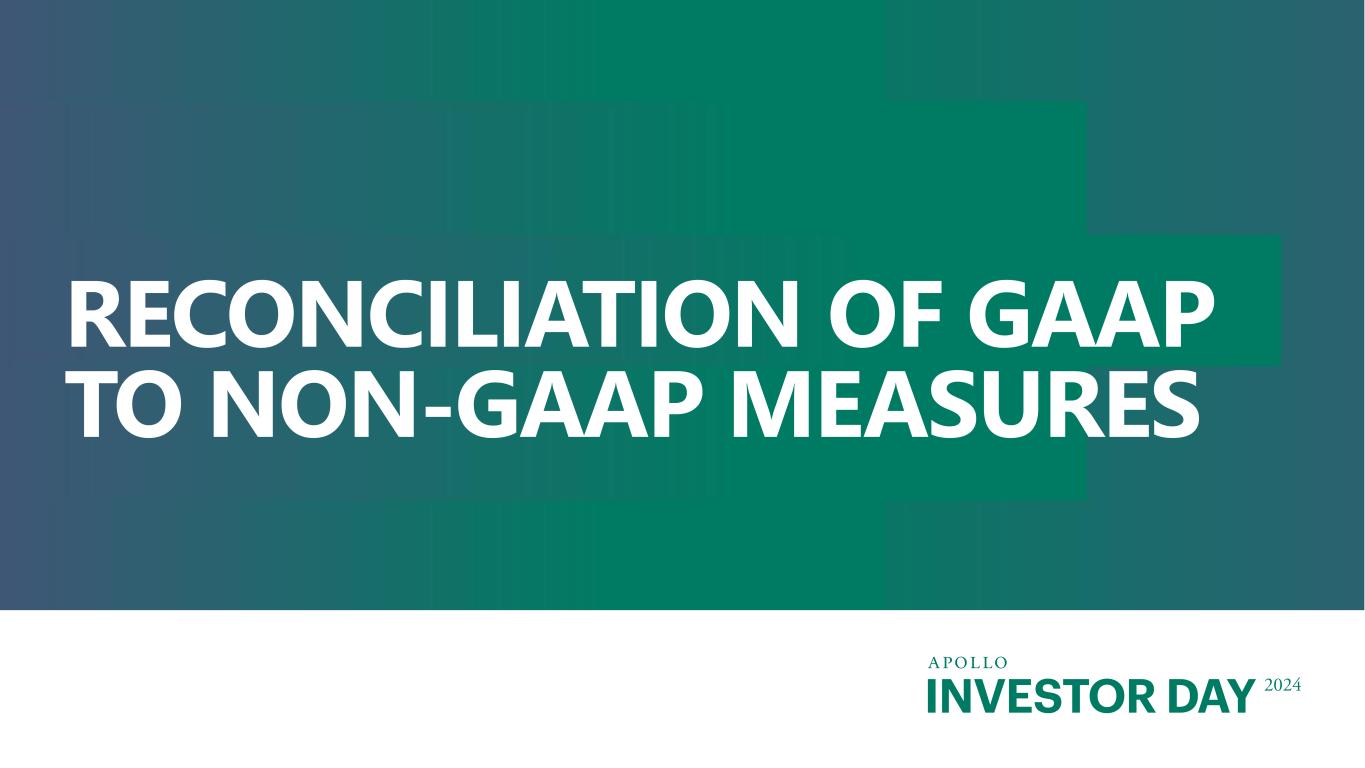 202 1. Equity-based profit sharing expense and other includes certain profit sharing arrangements in which a portion of performance fees distributed to the general partner are required to be used by employees of Apollo to purchase restricted shares of common stock or is delivered in the form of RSUs, which are granted under the Equity Plan. Equity-based profit sharing expense and other also includes performance grants which are tied to the Company’s receipt of performance fees, within prescribed periods, sufficient to cover the associated equity-based compensation expense. 2. Special equity-based compensation and other charges includes equity-based compensation expense and associated taxes related to the previously announced special fully vested equity grants to certain senior leaders. 3. Transaction-related charges include contingent consideration, equity-based compensation charges and the amortization of intangible assets and certain other charges associated with acquisitions, and restructuring charges. 4. Merger-related transaction and integration costs includes advisory services, technology integration, equity-based compensation charges and other costs associated with the Company’s merger with Athene. 5. Includes one-time equity-based compensation expense and associated taxes related to the Company’s compensation structure reset. 6. Includes change in fair values of derivatives and embedded derivatives, non-operating change in funding agreements, change in fair value of market risk benefits, and non-operating change in liability for future policy benefits. Reconciliation of GAAP to Non-GAAP Financial Measures INVESTOR DAY 2024 Year ended December 31, ($ in millions) 2021 2022 2023 LTM 2Q'21 LTM 2Q'24 YTD 2Q'24 GAAP Net income (loss) attributable to Apollo Global Management, Inc. Common Stockholders $ 1,802 $ (1,961) $ 5,001 $ 2,007 $ 5,623 $ 2,231 Preferred dividends 37 - 46 37 95 49 Net income (loss) attributable to non-controlling interests 2,428 (1,546) 1,462 2,732 1,445 662 GAAP Net income (loss) $ 4,267 $ (3,507) $ 6,509 $ 4,776 $ 7,163 $ 2,942 Income tax provision (benefit) 594 (739) (923) 639 (694) 683 GAAP Income (loss) before Income tax provision (benefit) $ 4,861 $ (4,246) $ 5,586 $ 5,415 $ 6,469 $ 3,625 Asset Management Adjustments: Equity-based profit sharing expense and other1 146 276 239 119 254 139 Equity-based compensation 80 185 236 71 284 158 Special equity-based compensation and other charges2 - - 438 - 438 - Preferred dividends (37) - - (37) - - Transaction-related charges3 35 (42) 32 56 116 77 Merger-related transaction and integration costs4 67 70 27 24 30 15 Charges associated with corporate conversion - - - 3 - - (Gains) losses from changes in tax receivable agreement liability (10) 26 13 (14) 14 1 Net (income) loss attributable to non-controlling interests in consolidated entities (418) 1,499 (1,556) (428) (1,541) (700) Unrealized performance fees (1,465) (2) (127) (2,497) (328) (354) Unrealized profit sharing expense 649 20 179 1,060 237 194 One-time equity-based compensation charges5 949 - - - - - HoldCo interest and other financing costs 170 122 88 171 77 30 Unrealized principal investment (income) loss (222) 176 (88) (530) (59) (10) Unrealized net (gains) losses from investment activities and other (2,431) (144) 26 (1,804) 35 29 Retirement Services Adjustments: Investment (gains) losses, net of offsets - 7,467 (170) - (190) 146 Non-operating change in insurance liabilities and related derivatives6 - (1,433) (182) - (889) (876) Integration, restructuring and other non-operating expenses - 133 130 - 134 61 Equity-based compensation expense - 56 88 - 83 24 Segment Income $ 2,374 $ 4,163 $ 4,959 $ 1,609 $ 5,164 $ 2,559 HoldCo interest and other financing costs (170) (122) (88) (171) (77) (30) Taxes and related payables (172) (795) (789) (119) (787) (456) Adjusted Net Income $ 2,032 $ 3,246 $ 4,082 $ 1,319 $ 4,300 $ 2,073 Notable items - 3 (115) - (90) - Tax impact of notable items - (1) 24 - 19 - Adjusted Net Income, Excluding Notable Items $ - $ 3,248 $ 3,991 $ - $ 4,229 $ 2,073
