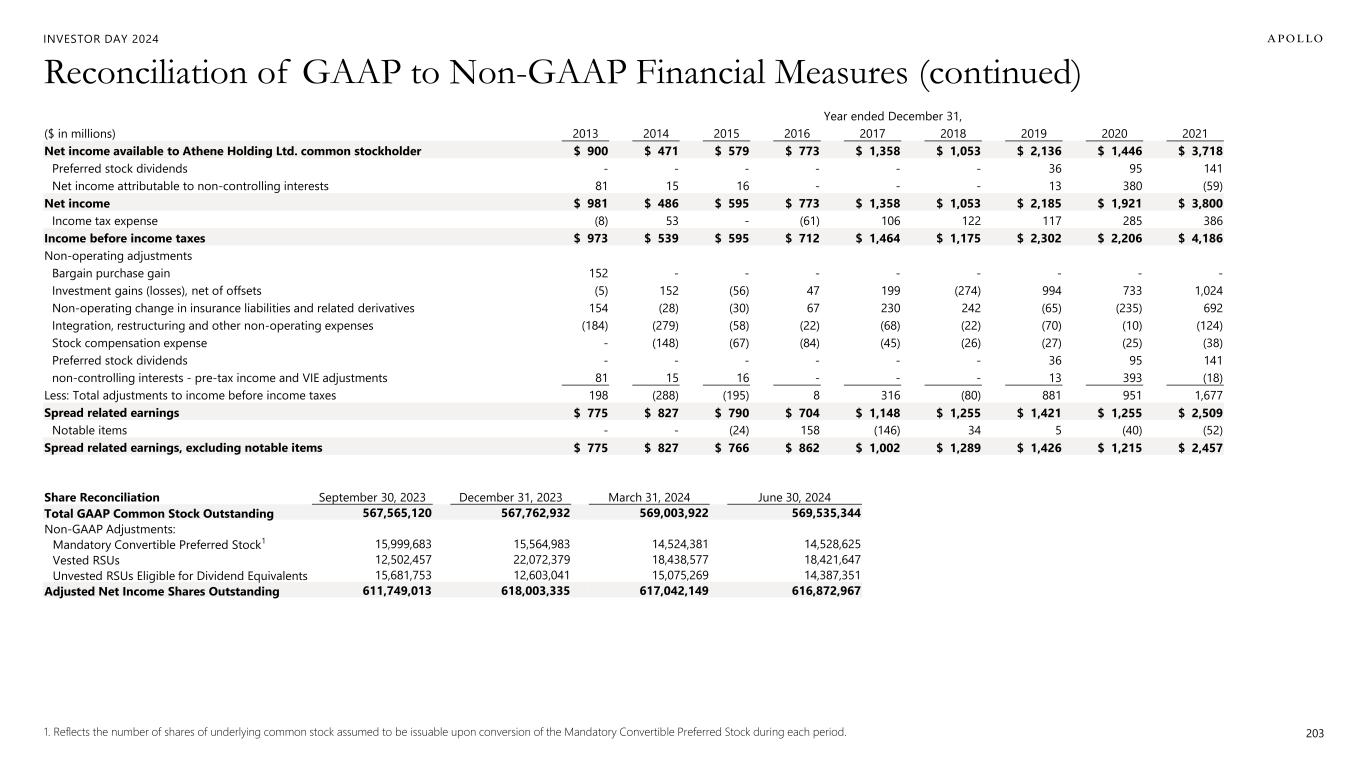 203 Reconciliation of GAAP to Non-GAAP Financial Measures (continued) INVESTOR DAY 2024 Year ended December 31, ($ in millions) 2013 2014 2015 2016 2017 2018 2019 2020 2021 Net income available to Athene Holding Ltd. common stockholder $ 900 $ 471 $ 579 $ 773 $ 1,358 $ 1,053 $ 2,136 $ 1,446 $ 3,718 Preferred stock dividends - - - - - - 36 95 141 Net income attributable to non-controlling interests 81 15 16 - - - 13 380 (59) Net income $ 981 $ 486 $ 595 $ 773 $ 1,358 $ 1,053 $ 2,185 $ 1,921 $ 3,800 Income tax expense (8) 53 - (61) 106 122 117 285 386 Income before income taxes $ 973 $ 539 $ 595 $ 712 $ 1,464 $ 1,175 $ 2,302 $ 2,206 $ 4,186 Non-operating adjustments Bargain purchase gain 152 - - - - - - - - Investment gains (losses), net of offsets (5) 152 (56) 47 199 (274) 994 733 1,024 Non-operating change in insurance liabilities and related derivatives 154 (28) (30) 67 230 242 (65) (235) 692 Integration, restructuring and other non-operating expenses (184) (279) (58) (22) (68) (22) (70) (10) (124) Stock compensation expense - (148) (67) (84) (45) (26) (27) (25) (38) Preferred stock dividends - - - - - - 36 95 141 non-controlling interests - pre-tax income and VIE adjustments 81 15 16 - - - 13 393 (18) Less: Total adjustments to income before income taxes 198 (288) (195) 8 316 (80) 881 951 1,677 Spread related earnings $ 775 $ 827 $ 790 $ 704 $ 1,148 $ 1,255 $ 1,421 $ 1,255 $ 2,509 Notable items - - (24) 158 (146) 34 5 (40) (52) Spread related earnings, excluding notable items $ 775 $ 827 $ 766 $ 862 $ 1,002 $ 1,289 $ 1,426 $ 1,215 $ 2,457 1. Reflects the number of shares of underlying common stock assumed to be issuable upon conversion of the Mandatory Convertible Preferred Stock during each period. Share Reconciliation September 30, 2023 December 31, 2023 March 31, 2024 June 30, 2024 Total GAAP Common Stock Outstanding 567,565,120 567,762,932 569,003,922 569,535,344 Non-GAAP Adjustments: Mandatory Convertible Preferred Stock1 15,999,683 15,564,983 14,524,381 14,528,625 Vested RSUs 12,502,457 22,072,379 18,438,577 18,421,647 Unvested RSUs Eligible for Dividend Equivalents 15,681,753 12,603,041 15,075,269 14,387,351 Adjusted Net Income Shares Outstanding 611,749,013 618,003,335 617,042,149 616,872,967