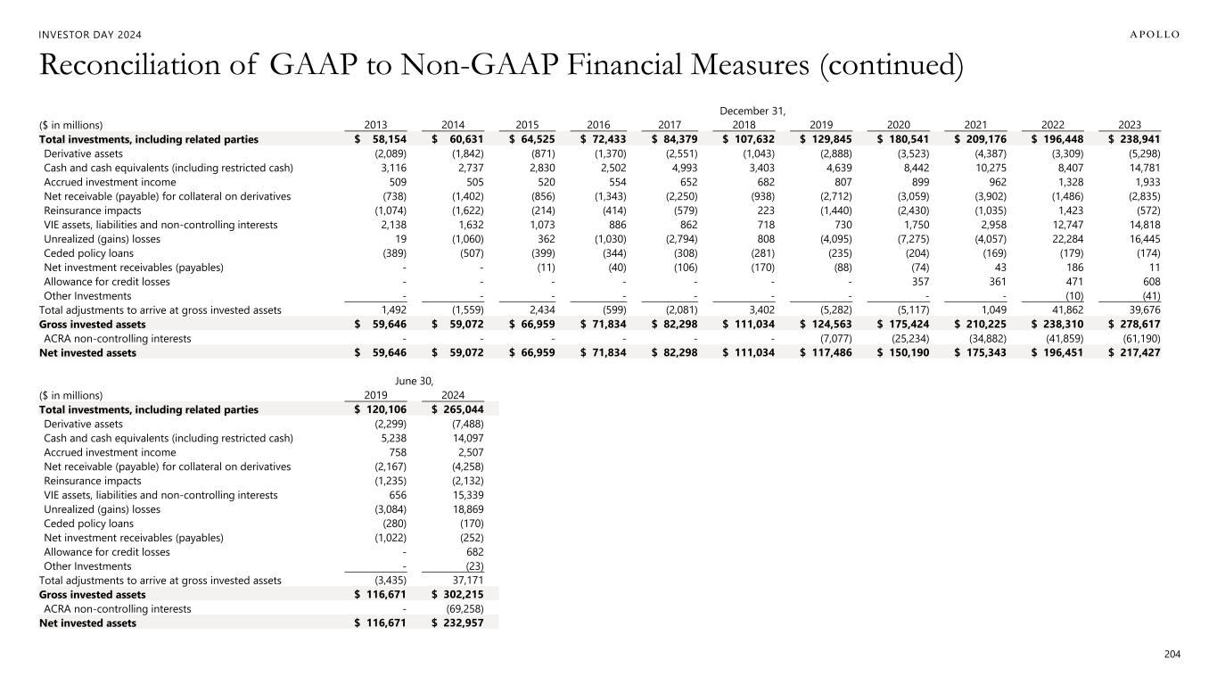 204 Reconciliation of GAAP to Non-GAAP Financial Measures (continued) INVESTOR DAY 2024 December 31, ($ in millions) 2013 2014 2015 2016 2017 2018 2019 2020 2021 2022 2023 Total investments, including related parties $ 58,154 $ 60,631 $ 64,525 $ 72,433 $ 84,379 $ 107,632 $ 129,845 $ 180,541 $ 209,176 $ 196,448 $ 238,941 Derivative assets (2,089) (1,842) (871) (1,370) (2,551) (1,043) (2,888) (3,523) (4,387) (3,309) (5,298) Cash and cash equivalents (including restricted cash) 3,116 2,737 2,830 2,502 4,993 3,403 4,639 8,442 10,275 8,407 14,781 Accrued investment income 509 505 520 554 652 682 807 899 962 1,328 1,933 Net receivable (payable) for collateral on derivatives (738) (1,402) (856) (1,343) (2,250) (938) (2,712) (3,059) (3,902) (1,486) (2,835) Reinsurance impacts (1,074) (1,622) (214) (414) (579) 223 (1,440) (2,430) (1,035) 1,423 (572) VIE assets, liabilities and non-controlling interests 2,138 1,632 1,073 886 862 718 730 1,750 2,958 12,747 14,818 Unrealized (gains) losses 19 (1,060) 362 (1,030) (2,794) 808 (4,095) (7,275) (4,057) 22,284 16,445 Ceded policy loans (389) (507) (399) (344) (308) (281) (235) (204) (169) (179) (174) Net investment receivables (payables) - - (11) (40) (106) (170) (88) (74) 43 186 11 Allowance for credit losses - - - - - - - 357 361 471 608 Other Investments - - - - - - - - - (10) (41) Total adjustments to arrive at gross invested assets 1,492 (1,559) 2,434 (599) (2,081) 3,402 (5,282) (5,117) 1,049 41,862 39,676 Gross invested assets $ 59,646 $ 59,072 $ 66,959 $ 71,834 $ 82,298 $ 111,034 $ 124,563 $ 175,424 $ 210,225 $ 238,310 $ 278,617 ACRA non-controlling interests - - - - - - (7,077) (25,234) (34,882) (41,859) (61,190) Net invested assets $ 59,646 $ 59,072 $ 66,959 $ 71,834 $ 82,298 $ 111,034 $ 117,486 $ 150,190 $ 175,343 $ 196,451 $ 217,427 June 30, ($ in millions) 2019 2024 Total investments, including related parties $ 120,106 $ 265,044 Derivative assets (2,299) (7,488) Cash and cash equivalents (including restricted cash) 5,238 14,097 Accrued investment income 758 2,507 Net receivable (payable) for collateral on derivatives (2,167) (4,258) Reinsurance impacts (1,235) (2,132) VIE assets, liabilities and non-controlling interests 656 15,339 Unrealized (gains) losses (3,084) 18,869 Ceded policy loans (280) (170) Net investment receivables (payables) (1,022) (252) Allowance for credit losses - 682 Other Investments - (23) Total adjustments to arrive at gross invested assets (3,435) 37,171 Gross invested assets $ 116,671 $ 302,215 ACRA non-controlling interests - (69,258) Net invested assets $ 116,671 $ 232,957
