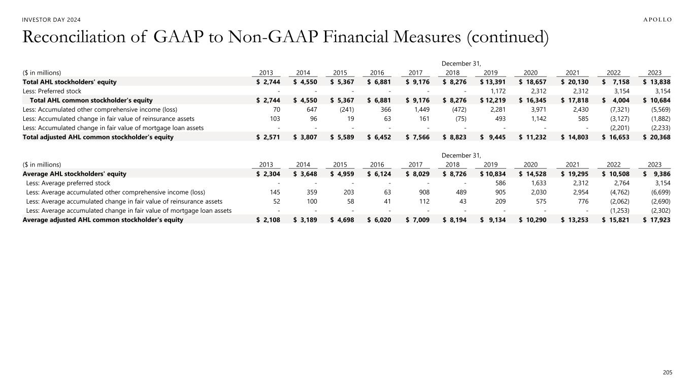INVESTOR DAY 2024 205 Reconciliation of GAAP to Non-GAAP Financial Measures (continued) December 31, ($ in millions) 2013 2014 2015 2016 2017 2018 2019 2020 2021 2022 2023 Total AHL stockholders' equity $ 2,744 $ 4,550 $ 5,367 $ 6,881 $ 9,176 $ 8,276 $ 13,391 $ 18,657 $ 20,130 $ 7,158 $ 13,838 Less: Preferred stock - - - - - - 1,172 2,312 2,312 3,154 3,154 Total AHL common stockholder's equity $ 2,744 $ 4,550 $ 5,367 $ 6,881 $ 9,176 $ 8,276 $ 12,219 $ 16,345 $ 17,818 $ 4,004 $ 10,684 Less: Accumulated other comprehensive income (loss) 70 647 (241) 366 1,449 (472) 2,281 3,971 2,430 (7,321) (5,569) Less: Accumulated change in fair value of reinsurance assets 103 96 19 63 161 (75) 493 1,142 585 (3,127) (1,882) Less: Accumulated change in fair value of mortgage loan assets - - - - - - - - - (2,201) (2,233) Total adjusted AHL common stockholder's equity $ 2,571 $ 3,807 $ 5,589 $ 6,452 $ 7,566 $ 8,823 $ 9,445 $ 11,232 $ 14,803 $ 16,653 $ 20,368 December 31, ($ in millions) 2013 2014 2015 2016 2017 2018 2019 2020 2021 2022 2023 Average AHL stockholders' equity $ 2,304 $ 3,648 $ 4,959 $ 6,124 $ 8,029 $ 8,726 $ 10,834 $ 14,528 $ 19,295 $ 10,508 $ 9,386 Less: Average preferred stock - - - - - - 586 1,633 2,312 2,764 3,154 Less: Average accumulated other comprehensive income (loss) 145 359 203 63 908 489 905 2,030 2,954 (4,762) (6,699) Less: Average accumulated change in fair value of reinsurance assets 52 100 58 41 112 43 209 575 776 (2,062) (2,690) Less: Average accumulated change in fair value of mortgage loan assets - - - - - - - - - (1,253) (2,302) Average adjusted AHL common stockholder's equity $ 2,108 $ 3,189 $ 4,698 $ 6,020 $ 7,009 $ 8,194 $ 9,134 $ 10,290 $ 13,253 $ 15,821 $ 17,923