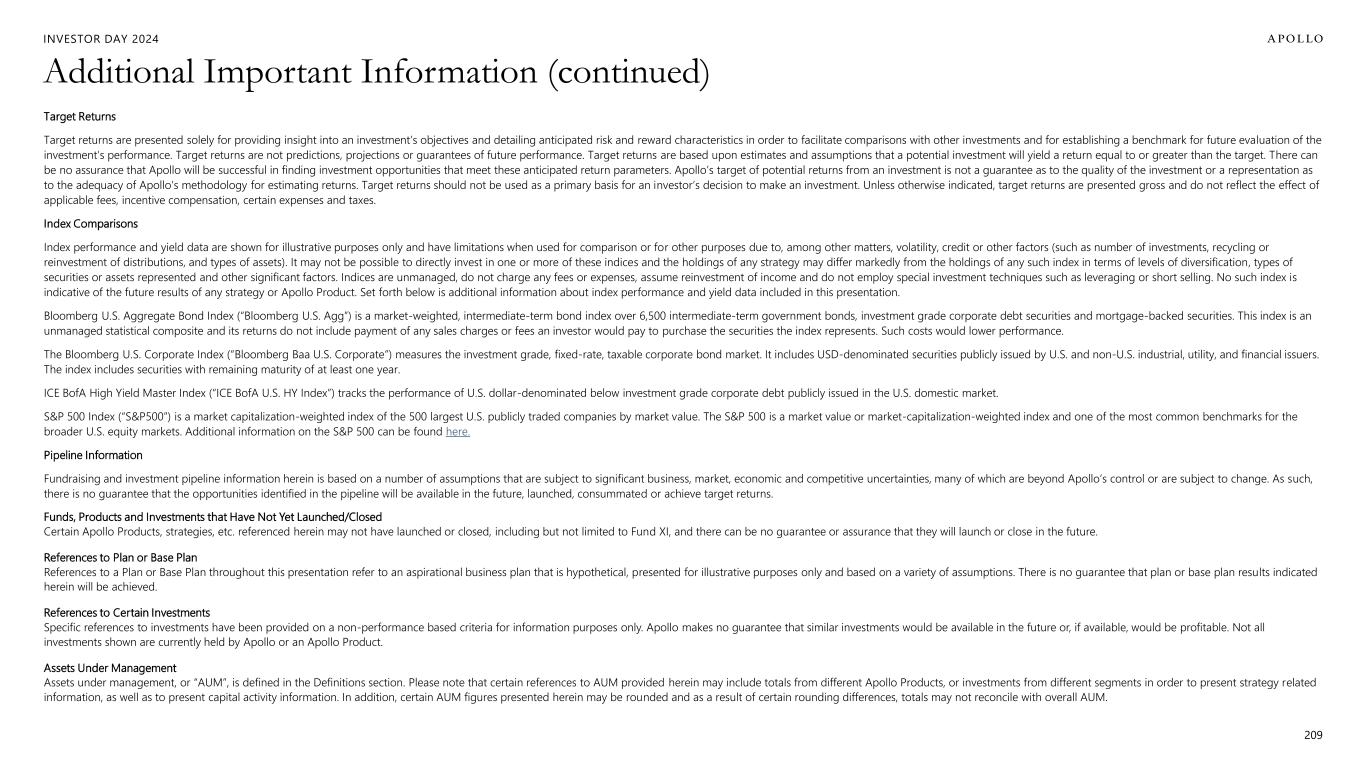 INVESTOR DAY 2024 Additional Important Information (continued) Target Returns Target returns are presented solely for providing insight into an investment’s objectives and detailing anticipated risk and reward characteristics in order to facilitate comparisons with other investments and for establishing a benchmark for future evaluation of the investment’s performance. Target returns are not predictions, projections or guarantees of future performance. Target returns are based upon estimates and assumptions that a potential investment will yield a return equal to or greater than the target. There can be no assurance that Apollo will be successful in finding investment opportunities that meet these anticipated return parameters. Apollo’s target of potential returns from an investment is not a guarantee as to the quality of the investment or a representation as to the adequacy of Apollo’s methodology for estimating returns. Target returns should not be used as a primary basis for an investor’s decision to make an investment. Unless otherwise indicated, target returns are presented gross and do not reflect the effect of applicable fees, incentive compensation, certain expenses and taxes. Index Comparisons Index performance and yield data are shown for illustrative purposes only and have limitations when used for comparison or for other purposes due to, among other matters, volatility, credit or other factors (such as number of investments, recycling or reinvestment of distributions, and types of assets). It may not be possible to directly invest in one or more of these indices and the holdings of any strategy may differ markedly from the holdings of any such index in terms of levels of diversification, types of securities or assets represented and other significant factors. Indices are unmanaged, do not charge any fees or expenses, assume reinvestment of income and do not employ special investment techniques such as leveraging or short selling. No such index is indicative of the future results of any strategy or Apollo Product. Set forth below is additional information about index performance and yield data included in this presentation. Bloomberg U.S. Aggregate Bond Index (“Bloomberg U.S. Agg”) is a market-weighted, intermediate-term bond index over 6,500 intermediate-term government bonds, investment grade corporate debt securities and mortgage-backed securities. This index is an unmanaged statistical composite and its returns do not include payment of any sales charges or fees an investor would pay to purchase the securities the index represents. Such costs would lower performance. The Bloomberg U.S. Corporate Index (“Bloomberg Baa U.S. Corporate”) measures the investment grade, fixed-rate, taxable corporate bond market. It includes USD-denominated securities publicly issued by U.S. and non-U.S. industrial, utility, and financial issuers. The index includes securities with remaining maturity of at least one year. ICE BofA High Yield Master Index (“ICE BofA U.S. HY Index”) tracks the performance of U.S. dollar-denominated below investment grade corporate debt publicly issued in the U.S. domestic market. S&P 500 Index (“S&P500”) is a market capitalization-weighted index of the 500 largest U.S. publicly traded companies by market value. The S&P 500 is a market value or market-capitalization-weighted index and one of the most common benchmarks for the broader U.S. equity markets. Additional information on the S&P 500 can be found here. Pipeline Information Fundraising and investment pipeline information herein is based on a number of assumptions that are subject to significant business, market, economic and competitive uncertainties, many of which are beyond Apollo’s control or are subject to change. As such, there is no guarantee that the opportunities identified in the pipeline will be available in the future, launched, consummated or achieve target returns. Funds, Products and Investments that Have Not Yet Launched/Closed Certain Apollo Products, strategies, etc. referenced herein may not have launched or closed, including but not limited to Fund XI, and there can be no guarantee or assurance that they will launch or close in the future. References to Plan or Base Plan References to a Plan or Base Plan throughout this presentation refer to an aspirational business plan that is hypothetical, presented for illustrative purposes only and based on a variety of assumptions. There is no guarantee that plan or base plan results indicated herein will be achieved. References to Certain Investments Specific references to investments have been provided on a non-performance based criteria for information purposes only. Apollo makes no guarantee that similar investments would be available in the future or, if available, would be profitable. Not all investments shown are currently held by Apollo or an Apollo Product. Assets Under Management Assets under management, or “AUM”, is defined in the Definitions section. Please note that certain references to AUM provided herein may include totals from different Apollo Products, or investments from different segments in order to present strategy related information, as well as to present capital activity information. In addition, certain AUM figures presented herein may be rounded and as a result of certain rounding differences, totals may not reconcile with overall AUM. 209
