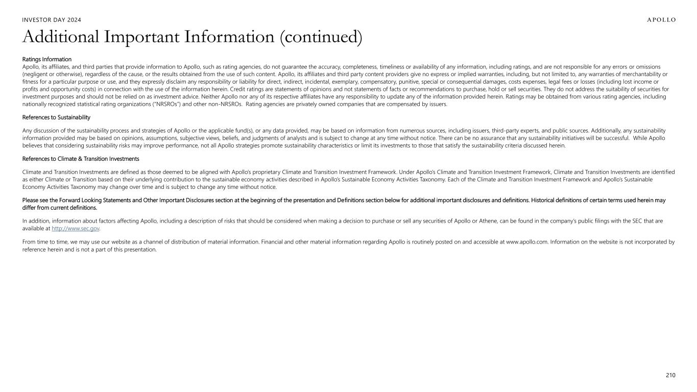 INVESTOR DAY 2024 Additional Important Information (continued) Ratings Information Apollo, its affiliates, and third parties that provide information to Apollo, such as rating agencies, do not guarantee the accuracy, completeness, timeliness or availability of any information, including ratings, and are not responsible for any errors or omissions (negligent or otherwise), regardless of the cause, or the results obtained from the use of such content. Apollo, its affiliates and third party content providers give no express or implied warranties, including, but not limited to, any warranties of merchantability or fitness for a particular purpose or use, and they expressly disclaim any responsibility or liability for direct, indirect, incidental, exemplary, compensatory, punitive, special or consequential damages, costs expenses, legal fees or losses (including lost income or profits and opportunity costs) in connection with the use of the information herein. Credit ratings are statements of opinions and not statements of facts or recommendations to purchase, hold or sell securities. They do not address the suitability of securities for investment purposes and should not be relied on as investment advice. Neither Apollo nor any of its respective affiliates have any responsibility to update any of the information provided herein. Ratings may be obtained from various rating agencies, including nationally recognized statistical rating organizations (“NRSROs”) and other non-NRSROs. Rating agencies are privately owned companies that are compensated by issuers. References to Sustainability Any discussion of the sustainability process and strategies of Apollo or the applicable fund(s), or any data provided, may be based on information from numerous sources, including issuers, third-party experts, and public sources. Additionally, any sustainability information provided may be based on opinions, assumptions, subjective views, beliefs, and judgments of analysts and is subject to change at any time without notice. There can be no assurance that any sustainability initiatives will be successful. While Apollo believes that considering sustainability risks may improve performance, not all Apollo strategies promote sustainability characteristics or limit its investments to those that satisfy the sustainability criteria discussed herein. References to Climate & Transition Investments Climate and Transition Investments are defined as those deemed to be aligned with Apollo’s proprietary Climate and Transition Investment Framework. Under Apollo’s Climate and Transition Investment Framework, Climate and Transition Investments are identified as either Climate or Transition based on their underlying contribution to the sustainable economy activities described in Apollo’s Sustainable Economy Activities Taxonomy. Each of the Climate and Transition Investment Framework and Apollo’s Sustainable Economy Activities Taxonomy may change over time and is subject to change any time without notice. Please see the Forward Looking Statements and Other Important Disclosures section at the beginning of the presentation and Definitions section below for additional important disclosures and definitions. Historical definitions of certain terms used herein may differ from current definitions. In addition, information about factors affecting Apollo, including a description of risks that should be considered when making a decision to purchase or sell any securities of Apollo or Athene, can be found in the company’s public filings with the SEC that are available at http://www.sec.gov. From time to time, we may use our website as a channel of distribution of material information. Financial and other material information regarding Apollo is routinely posted on and accessible at www.apollo.com. Information on the website is not incorporated by reference herein and is not a part of this presentation. 210