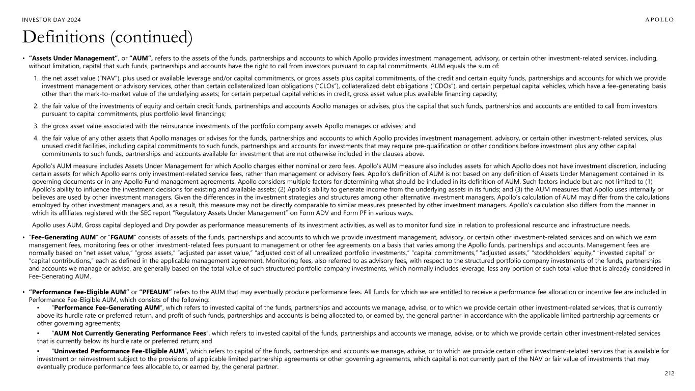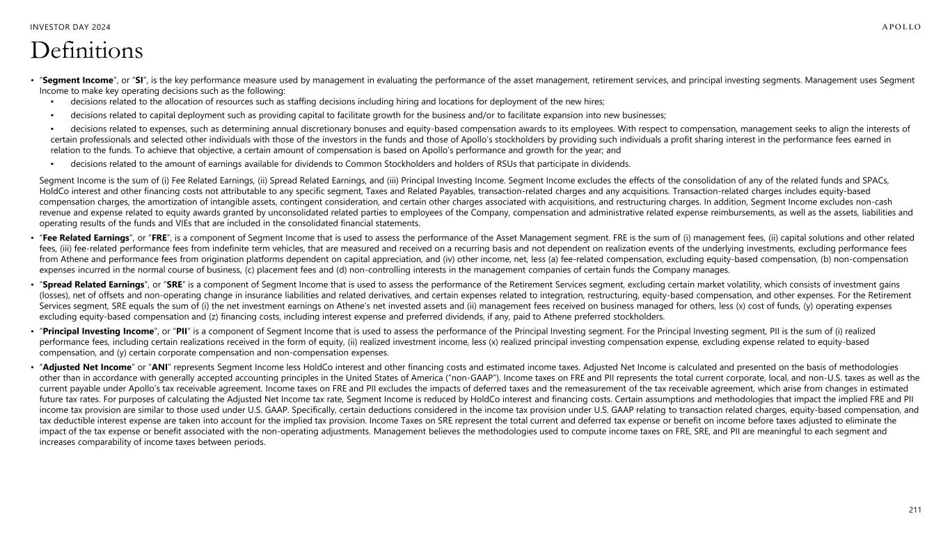 INVESTOR DAY 2024 211 Definitions • “Segment Income”, or “SI”, is the key performance measure used by management in evaluating the performance of the asset management, retirement services, and principal investing segments. Management uses Segment Income to make key operating decisions such as the following: ▪ decisions related to the allocation of resources such as staffing decisions including hiring and locations for deployment of the new hires; ▪ decisions related to capital deployment such as providing capital to facilitate growth for the business and/or to facilitate expansion into new businesses; ▪ decisions related to expenses, such as determining annual discretionary bonuses and equity-based compensation awards to its employees. With respect to compensation, management seeks to align the interests of certain professionals and selected other individuals with those of the investors in the funds and those of Apollo’s stockholders by providing such individuals a profit sharing interest in the performance fees earned in relation to the funds. To achieve that objective, a certain amount of compensation is based on Apollo’s performance and growth for the year; and ▪ decisions related to the amount of earnings available for dividends to Common Stockholders and holders of RSUs that participate in dividends. Segment Income is the sum of (i) Fee Related Earnings, (ii) Spread Related Earnings, and (iii) Principal Investing Income. Segment Income excludes the effects of the consolidation of any of the related funds and SPACs, HoldCo interest and other financing costs not attributable to any specific segment, Taxes and Related Payables, transaction-related charges and any acquisitions. Transaction-related charges includes equity-based compensation charges, the amortization of intangible assets, contingent consideration, and certain other charges associated with acquisitions, and restructuring charges. In addition, Segment Income excludes non-cash revenue and expense related to equity awards granted by unconsolidated related parties to employees of the Company, compensation and administrative related expense reimbursements, as well as the assets, liabilities and operating results of the funds and VIEs that are included in the consolidated financial statements. • “Fee Related Earnings”, or “FRE”, is a component of Segment Income that is used to assess the performance of the Asset Management segment. FRE is the sum of (i) management fees, (ii) capital solutions and other related fees, (iii) fee-related performance fees from indefinite term vehicles, that are measured and received on a recurring basis and not dependent on realization events of the underlying investments, excluding performance fees from Athene and performance fees from origination platforms dependent on capital appreciation, and (iv) other income, net, less (a) fee-related compensation, excluding equity-based compensation, (b) non-compensation expenses incurred in the normal course of business, (c) placement fees and (d) non-controlling interests in the management companies of certain funds the Company manages. • “Spread Related Earnings”, or “SRE” is a component of Segment Income that is used to assess the performance of the Retirement Services segment, excluding certain market volatility, which consists of investment gains (losses), net of offsets and non-operating change in insurance liabilities and related derivatives, and certain expenses related to integration, restructuring, equity-based compensation, and other expenses. For the Retirement Services segment, SRE equals the sum of (i) the net investment earnings on Athene’s net invested assets and (ii) management fees received on business managed for others, less (x) cost of funds, (y) operating expenses excluding equity-based compensation and (z) financing costs, including interest expense and preferred dividends, if any, paid to Athene preferred stockholders. • “Principal Investing Income”, or “PII” is a component of Segment Income that is used to assess the performance of the Principal Investing segment. For the Principal Investing segment, PII is the sum of (i) realized performance fees, including certain realizations received in the form of equity, (ii) realized investment income, less (x) realized principal investing compensation expense, excluding expense related to equity-based compensation, and (y) certain corporate compensation and non-compensation expenses. • “Adjusted Net Income” or “ANI” represents Segment Income less HoldCo interest and other financing costs and estimated income taxes. Adjusted Net Income is calculated and presented on the basis of methodologies other than in accordance with generally accepted accounting principles in the United States of America (“non-GAAP”). Income taxes on FRE and PII represents the total current corporate, local, and non-U.S. taxes as well as the current payable under Apollo’s tax receivable agreement. Income taxes on FRE and PII excludes the impacts of deferred taxes and the remeasurement of the tax receivable agreement, which arise from changes in estimated future tax rates. For purposes of calculating the Adjusted Net Income tax rate, Segment Income is reduced by HoldCo interest and financing costs. Certain assumptions and methodologies that impact the implied FRE and PII income tax provision are similar to those used under U.S. GAAP. Specifically, certain deductions considered in the income tax provision under U.S. GAAP relating to transaction related charges, equity-based compensation, and tax deductible interest expense are taken into account for the implied tax provision. Income Taxes on SRE represent the total current and deferred tax expense or benefit on income before taxes adjusted to eliminate the impact of the tax expense or benefit associated with the non-operating adjustments. Management believes the methodologies used to compute income taxes 