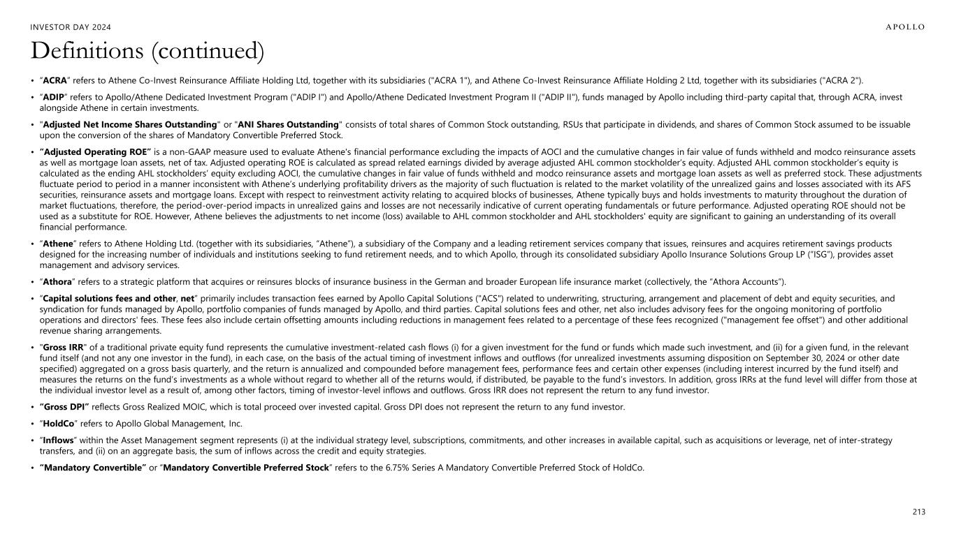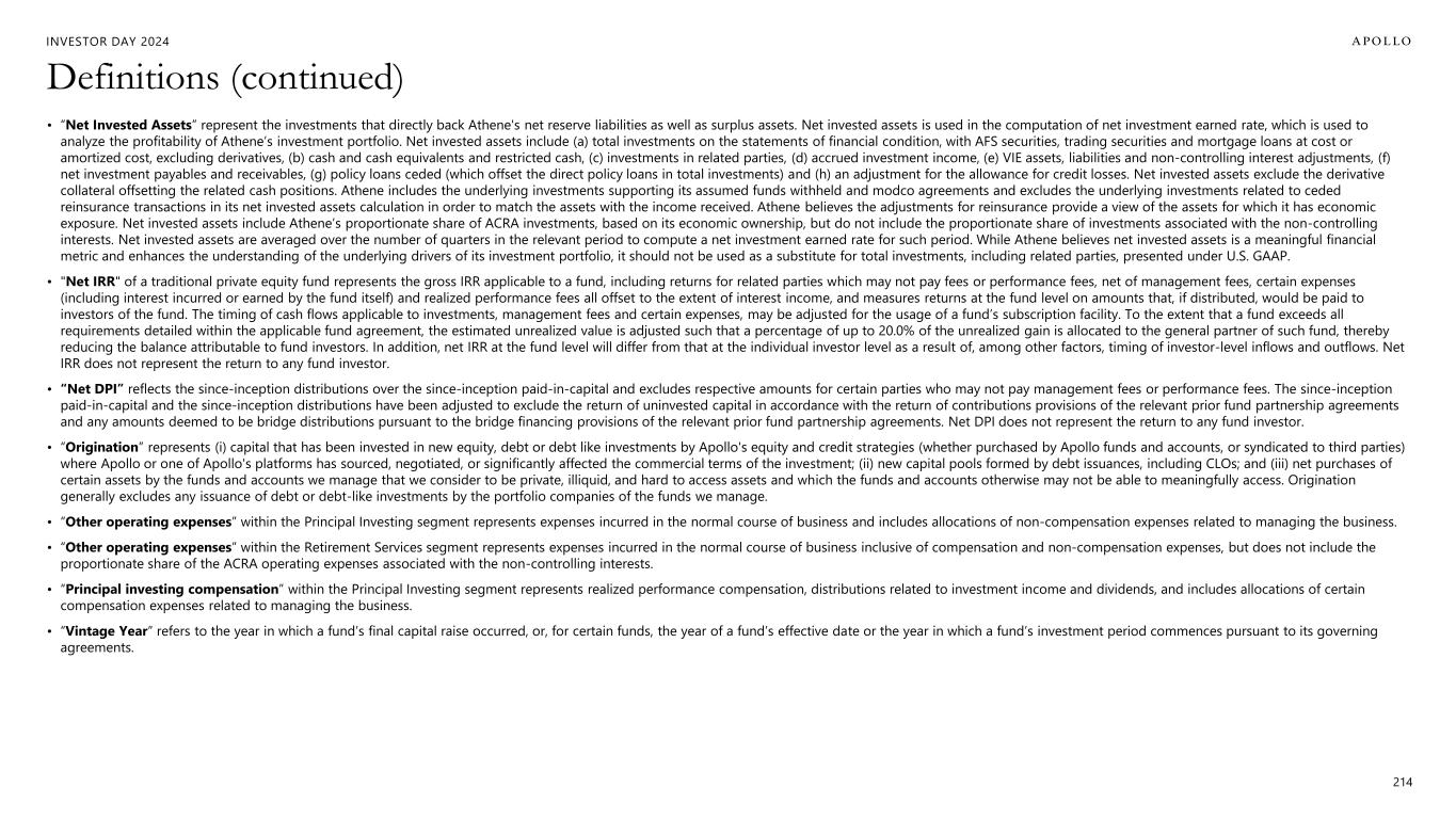 INVESTOR DAY 2024 213 Definitions (continued) • “ACRA” refers to Athene Co-Invest Reinsurance Affiliate Holding Ltd, together with its subsidiaries ("ACRA 1"), and Athene Co-Invest Reinsurance Affiliate Holding 2 Ltd, together with its subsidiaries ("ACRA 2"). • “ADIP” refers to Apollo/Athene Dedicated Investment Program ("ADIP I") and Apollo/Athene Dedicated Investment Program II ("ADIP II"), funds managed by Apollo including third-party capital that, through ACRA, invest alongside Athene in certain investments. • "Adjusted Net Income Shares Outstanding" or "ANI Shares Outstanding" consists of total shares of Common Stock outstanding, RSUs that participate in dividends, and shares of Common Stock assumed to be issuable upon the conversion of the shares of Mandatory Convertible Preferred Stock. • “Adjusted Operating ROE” is a non-GAAP measure used to evaluate Athene's financial performance excluding the impacts of AOCI and the cumulative changes in fair value of funds withheld and modco reinsurance assets as well as mortgage loan assets, net of tax. Adjusted operating ROE is calculated as spread related earnings divided by average adjusted AHL common stockholder’s equity. Adjusted AHL common stockholder’s equity is calculated as the ending AHL stockholders’ equity excluding AOCI, the cumulative changes in fair value of funds withheld and modco reinsurance assets and mortgage loan assets as well as preferred stock. These adjustments fluctuate period to period in a manner inconsistent with Athene’s underlying profitability drivers as the majority of such fluctuation is related to the market volatility of the unrealized gains and losses associated with its AFS securities, reinsurance assets and mortgage loans. Except with respect to reinvestment activity relating to acquired blocks of businesses, Athene typically buys and holds investments to maturity throughout the duration of market fluctuations, therefore, the period-over-period impacts in unrealized gains and losses are not necessarily indicative of current operating fundamentals or future performance. Adjusted operating ROE should not be used as a substitute for ROE. However, Athene believes the adjustments to net income (loss) available to AHL common stockholder and AHL stockholders' equity are significant to gaining an understanding of its overall financial performance. • “Athene” refers to Athene Holding Ltd. (together with its subsidiaries, “Athene”), a subsidiary of the Company and a leading retirement services company that issues, reinsures and acquires retirement savings products designed for the increasing number of individuals and institutions seeking to fund retirement needs, and to which Apollo, through its consolidated subsidiary Apollo Insurance Solutions Group LP (“ISG”), provides asset management and advisory services. • “Athora” refers to a strategic platform that acquires or reinsures blocks of insurance business in the German and broader European life insurance market (collectively, the “Athora Accounts”). • “Capital solutions fees and other, net” primarily includes transaction fees earned by Apollo Capital Solutions ("ACS") related to underwriting, structuring, arrangement and placement of debt and equity securities, and syndication for funds managed by Apollo, portfolio companies of funds managed by Apollo, and third parties. Capital solutions fees and other, net also includes advisory fees for the ongoing monitoring of portfolio operations and directors' fees. These fees also include certain offsetting amounts including reductions in management fees related to a percentage of these fees recognized ("management fee offset") and other additional revenue sharing arrangements. • "Gross IRR" of a traditional private equity fund represents the cumulative investment-related cash flows (i) for a given investment for the fund or funds which made such investment, and (ii) for a given fund, in the relevant fund itself (and not any one investor in the fund), in each case, on the basis of the actual timing of investment inflows and outflows (for unrealized investments assuming disposition on September 30, 2024 or other date specified) aggregated on a gross basis quarterly, and the return is annualized and compounded before management fees, performance fees and certain other expenses (including interest incurred by the fund itself) and measures the returns on the fund’s investments as a whole without regard to whether all of the returns would, if distributed, be payable to the fund’s investors. In addition, gross IRRs at the fund level will differ from those at the individual investor level as a result of, among other factors, timing of investor-level inflows and outflows. Gross IRR does not represent the return to any fund investor. • “Gross DPI” reflects Gross Realized MOIC, which is total proceed over invested capital. Gross DPI does not represent the return to any fund investor. • “HoldCo” refers to Apollo Global Management, Inc. • “Inflows” within the Asset Management segment represents (i) at the individual strategy level, subscriptions, commitments, and other increases in available capital, such as acquisitions or leverage, net of inter-strategy transfers, and (ii) on an aggregate basis, the sum of inflows across the credit and equity strategies. • “Mandatory Convertible” or “Mandatory Convertible Preferred Stock” refers to the 6.75% Series A Mandatory Convertible Preferred Stock of HoldCo.