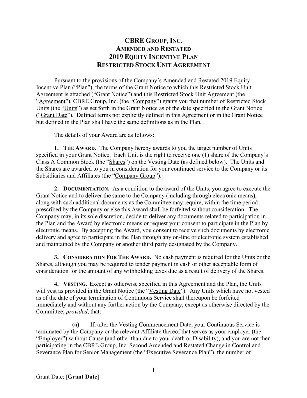 1 Grant Date: [Grant Date] CBRE GROUP, INC. AMENDED AND RESTATED 2019 EQUITY INCENTIVE PLAN RESTRICTED STOCK UNIT AGREEMENT Pursuant to the provisions of the Company’s Amended and Restated 2019 Equity Incentive Plan (“Plan”), the terms of the Grant Notice to which this Restricted Stock Unit Agreement is attached (“Grant Notice”) and this Restricted Stock Unit Agreement (the “Agreement”), CBRE Group, Inc. (the “Company”) grants you that number of Restricted Stock Units (the “Units”) as set forth in the Grant Notice as of the date specified in the Grant Notice (“Grant Date”). Defined terms not explicitly defined in this Agreement or in the Grant Notice but defined in the Plan shall have the same definitions as in the Plan. The details of your Award are as follows: 1. THE AWARD. The Company hereby awards to you the target number of Units specified in your Grant Notice. Each Unit is the right to receive one (1) share of the Company’s Class A Common Stock (the “Shares”) on the Vesting Date (as defined below). The Units and the Shares are awarded to you in consideration for your continued service to the Company or its Subsidiaries and Affiliates (the “Company Group”). 2. DOCUMENTATION. As a condition to the award of the Units, you agree to execute the Grant Notice and to deliver the same to the Company (including through electronic means), along with such additional documents as the Committee may require, within the time period prescribed by the Company or else this Award shall be forfeited without consideration. The Company may, in its sole discretion, decide to deliver any documents related to participation in the Plan and the Award by electronic means or request your consent to participate in the Plan by electronic means. By accepting the Award, you consent to receive such documents by electronic delivery and agree to participate in the Plan through any on-line or electronic system established and maintained by the Company or another third party designated by the Company. 3. CONSIDERATION FOR THE AWARD. No cash payment is required for the Units or the Shares, although you may be required to tender payment in cash or other acceptable form of consideration for the amount of any withholding taxes due as a result of delivery of the Shares. 4. VESTING. Except as otherwise specified in this Agreement and the Plan, the Units will vest as provided in the Grant Notice (the “Vesting Date”). Any Units which have not vested as of the date of your termination of Continuous Service shall thereupon be forfeited immediately and without any further action by the Company, except as otherwise directed by the Committee; provided, that: (a) If, after the Vesting Commencement Date, your Continuous Service is terminated by the Company or the relevant Affiliate thereof that serves as your employer (the “Employer”) without Cause (and other than due to your death or Disability), and you are not then participating in the CBRE Group, Inc. Second Amended and Restated Change in Control and Severance Plan for Senior Management (the “Executive Severance Plan”), the number of