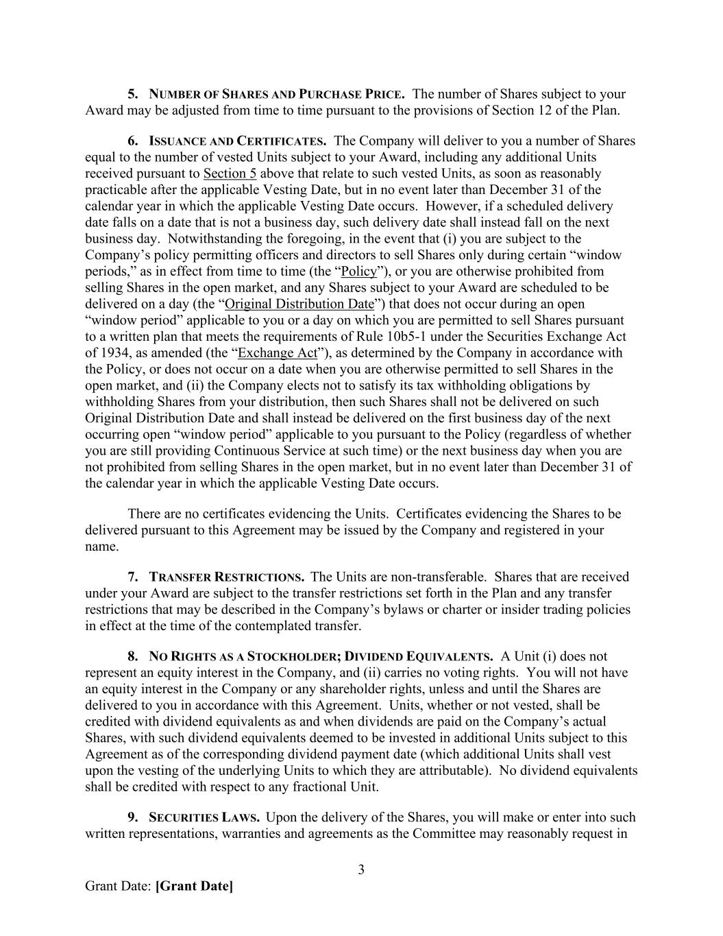 3 Grant Date: [Grant Date] 5. NUMBER OF SHARES AND PURCHASE PRICE. The number of Shares subject to your Award may be adjusted from time to time pursuant to the provisions of Section 12 of the Plan. 6. ISSUANCE AND CERTIFICATES. The Company will deliver to you a number of Shares equal to the number of vested Units subject to your Award, including any additional Units received pursuant to Section 5 above that relate to such vested Units, as soon as reasonably practicable after the applicable Vesting Date, but in no event later than December 31 of the calendar year in which the applicable Vesting Date occurs. However, if a scheduled delivery date falls on a date that is not a business day, such delivery date shall instead fall on the next business day. Notwithstanding the foregoing, in the event that (i) you are subject to the Company’s policy permitting officers and directors to sell Shares only during certain “window periods,” as in effect from time to time (the “Policy”), or you are otherwise prohibited from selling Shares in the open market, and any Shares subject to your Award are scheduled to be delivered on a day (the “Original Distribution Date”) that does not occur during an open “window period” applicable to you or a day on which you are permitted to sell Shares pursuant to a written plan that meets the requirements of Rule 10b5-1 under the Securities Exchange Act of 1934, as amended (the “Exchange Act”), as determined by the Company in accordance with the Policy, or does not occur on a date when you are otherwise permitted to sell Shares in the open market, and (ii) the Company elects not to satisfy its tax withholding obligations by withholding Shares from your distribution, then such Shares shall not be delivered on such Original Distribution Date and shall instead be delivered on the first business day of the next occurring open “window period” applicable to you pursuant to the Policy (regardless of whether you are still providing Continuous Service at such time) or the next business day when you are not prohibited from selling Shares in the open market, but in no event later than December 31 of the calendar year in which the applicable Vesting Date occurs. There are no certificates evidencing the Units. Certificates evidencing the Shares to be delivered pursuant to this Agreement may be issued by the Company and registered in your name. 7. TRANSFER RESTRICTIONS. The Units are non-transferable. Shares that are received under your Award are subject to the transfer restrictions set forth in the Plan and any transfer restrictions that may be described in the Company’s bylaws or charter or insider trading policies in effect at the time of the contemplated transfer. 8. NO RIGHTS AS A STOCKHOLDER; DIVIDEND EQUIVALENTS. A Unit (i) does not represent an equity interest in the Company, and (ii) carries no voting rights. You will not have an equity interest in the Company or any shareholder rights, unless and until the Shares are delivered to you in accordance with this Agreement. Units, whether or not vested, shall be credited with dividend equivalents as and when dividends are paid on the Company’s actual Shares, with such dividend equivalents deemed to be invested in additional Units subject to this Agreement as of the corresponding dividend payment date (which additional Units shall vest upon the vesting of the underlying Units to which they are attributable). No dividend equivalents shall be credited with respect to any fractional Unit. 9. SECURITIES LAWS. Upon the delivery of the Shares, you will make or enter into such written representations, warranties and agreements as the Committee may reasonably request in