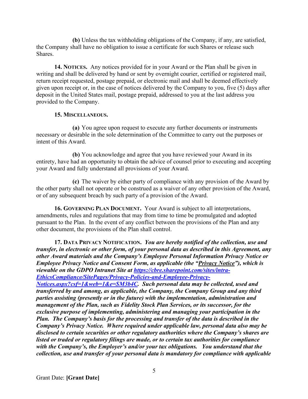 5 Grant Date: [Grant Date] (b) Unless the tax withholding obligations of the Company, if any, are satisfied, the Company shall have no obligation to issue a certificate for such Shares or release such Shares. 14. NOTICES. Any notices provided for in your Award or the Plan shall be given in writing and shall be delivered by hand or sent by overnight courier, certified or registered mail, return receipt requested, postage prepaid, or electronic mail and shall be deemed effectively given upon receipt or, in the case of notices delivered by the Company to you, five (5) days after deposit in the United States mail, postage prepaid, addressed to you at the last address you provided to the Company. 15. MISCELLANEOUS. (a) You agree upon request to execute any further documents or instruments necessary or desirable in the sole determination of the Committee to carry out the purposes or intent of this Award. (b) You acknowledge and agree that you have reviewed your Award in its entirety, have had an opportunity to obtain the advice of counsel prior to executing and accepting your Award and fully understand all provisions of your Award. (c) The waiver by either party of compliance with any provision of the Award by the other party shall not operate or be construed as a waiver of any other provision of the Award, or of any subsequent breach by such party of a provision of the Award. 16. GOVERNING PLAN DOCUMENT. Your Award is subject to all interpretations, amendments, rules and regulations that may from time to time be promulgated and adopted pursuant to the Plan. In the event of any conflict between the provisions of the Plan and any other document, the provisions of the Plan shall control. 17. DATA PRIVACY NOTIFICATION. You are hereby notified of the collection, use and transfer, in electronic or other form, of your personal data as described in this Agreement, any other Award materials and the Company’s Employee Personal Information Privacy Notice or Employee Privacy Notice and Consent Form, as applicable (the “Privacy Notice”), which is viewable on the GDPO Intranet Site at https://cbre.sharepoint.com/sites/intra- EthicsCompliance/SitePages/Privacy-Policies-and-Employee-Privacy- Notices.aspx?csf=1&web=1&e=SM3b4C. Such personal data may be collected, used and transferred by and among, as applicable, the Company, the Company Group and any third parties assisting (presently or in the future) with the implementation, administration and management of the Plan, such as Fidelity Stock Plan Services, or its successor, for the exclusive purpose of implementing, administering and managing your participation in the Plan. The Company’s basis for the processing and transfer of the data is described in the Company’s Privacy Notice. Where required under applicable law, personal data also may be disclosed to certain securities or other regulatory authorities where the Company’s shares are listed or traded or regulatory filings are made, or to certain tax authorities for compliance with the Company’s, the Employer’s and/or your tax obligations. You understand that the collection, use and transfer of your personal data is mandatory for compliance with applicable