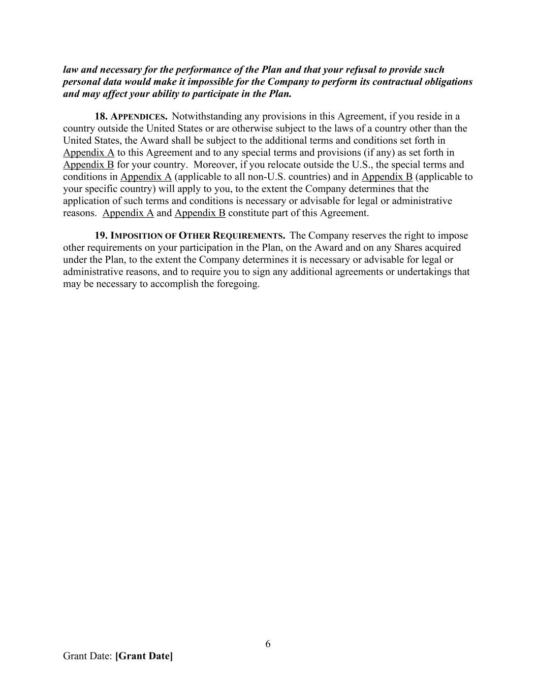 6 Grant Date: [Grant Date] law and necessary for the performance of the Plan and that your refusal to provide such personal data would make it impossible for the Company to perform its contractual obligations and may affect your ability to participate in the Plan. 18. APPENDICES. Notwithstanding any provisions in this Agreement, if you reside in a country outside the United States or are otherwise subject to the laws of a country other than the United States, the Award shall be subject to the additional terms and conditions set forth in Appendix A to this Agreement and to any special terms and provisions (if any) as set forth in Appendix B for your country. Moreover, if you relocate outside the U.S., the special terms and conditions in Appendix A (applicable to all non-U.S. countries) and in Appendix B (applicable to your specific country) will apply to you, to the extent the Company determines that the application of such terms and conditions is necessary or advisable for legal or administrative reasons. Appendix A and Appendix B constitute part of this Agreement. 19. IMPOSITION OF OTHER REQUIREMENTS. The Company reserves the right to impose other requirements on your participation in the Plan, on the Award and on any Shares acquired under the Plan, to the extent the Company determines it is necessary or advisable for legal or administrative reasons, and to require you to sign any additional agreements or undertakings that may be necessary to accomplish the foregoing.