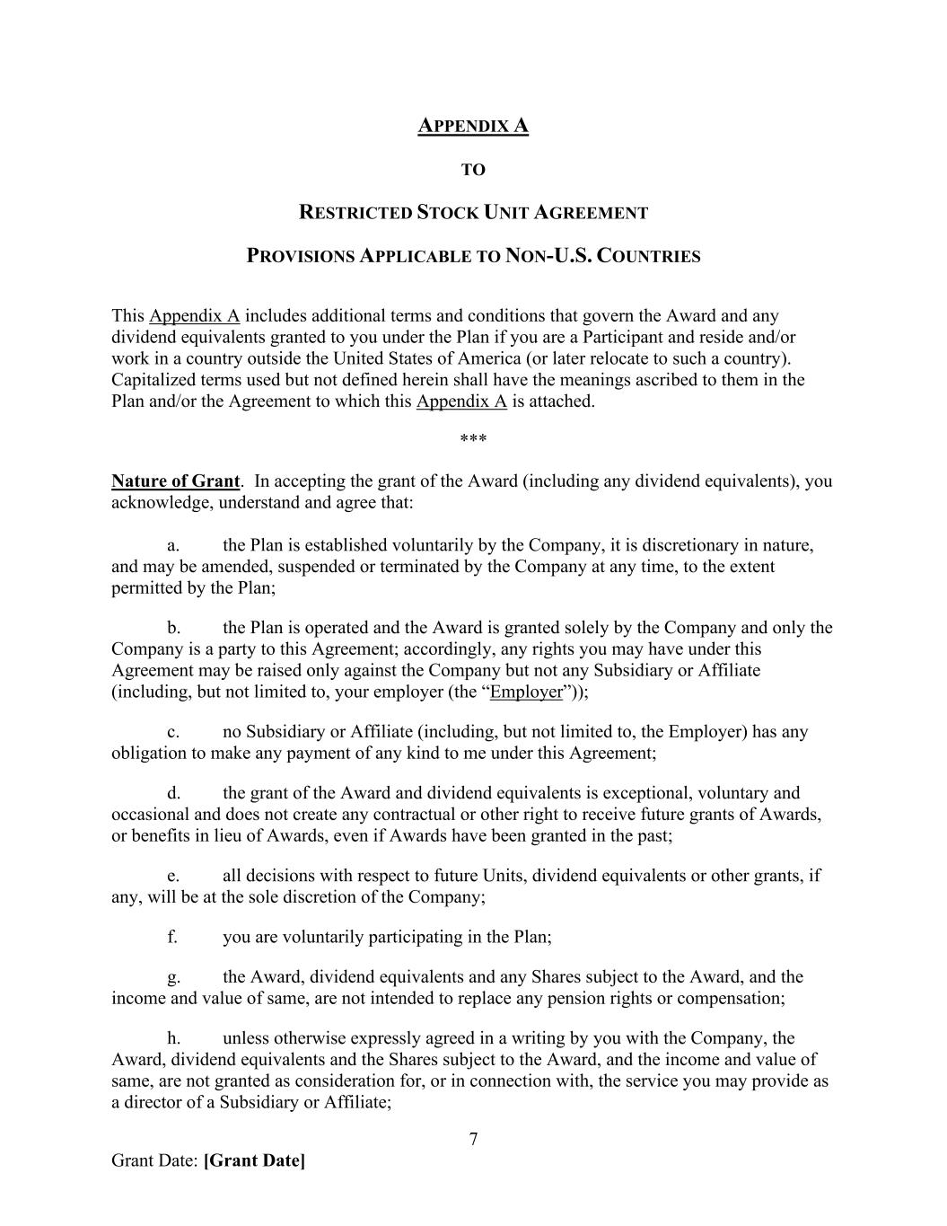 7 Grant Date: [Grant Date] APPENDIX A TO RESTRICTED STOCK UNIT AGREEMENT PROVISIONS APPLICABLE TO NON-U.S. COUNTRIES This Appendix A includes additional terms and conditions that govern the Award and any dividend equivalents granted to you under the Plan if you are a Participant and reside and/or work in a country outside the United States of America (or later relocate to such a country). Capitalized terms used but not defined herein shall have the meanings ascribed to them in the Plan and/or the Agreement to which this Appendix A is attached. *** Nature of Grant. In accepting the grant of the Award (including any dividend equivalents), you acknowledge, understand and agree that: a. the Plan is established voluntarily by the Company, it is discretionary in nature, and may be amended, suspended or terminated by the Company at any time, to the extent permitted by the Plan; b. the Plan is operated and the Award is granted solely by the Company and only the Company is a party to this Agreement; accordingly, any rights you may have under this Agreement may be raised only against the Company but not any Subsidiary or Affiliate (including, but not limited to, your employer (the “Employer”)); c. no Subsidiary or Affiliate (including, but not limited to, the Employer) has any obligation to make any payment of any kind to me under this Agreement; d. the grant of the Award and dividend equivalents is exceptional, voluntary and occasional and does not create any contractual or other right to receive future grants of Awards, or benefits in lieu of Awards, even if Awards have been granted in the past; e. all decisions with respect to future Units, dividend equivalents or other grants, if any, will be at the sole discretion of the Company; f. you are voluntarily participating in the Plan; g. the Award, dividend equivalents and any Shares subject to the Award, and the income and value of same, are not intended to replace any pension rights or compensation; h. unless otherwise expressly agreed in a writing by you with the Company, the Award, dividend equivalents and the Shares subject to the Award, and the income and value of same, are not granted as consideration for, or in connection with, the service you may provide as a director of a Subsidiary or Affiliate;