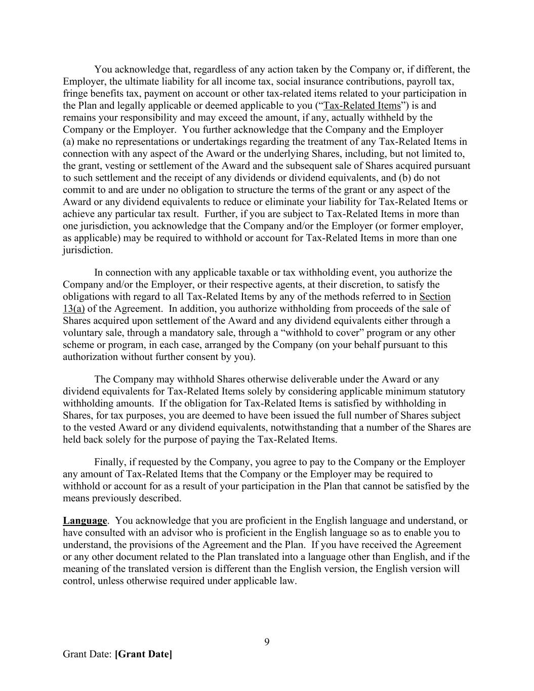 9 Grant Date: [Grant Date] You acknowledge that, regardless of any action taken by the Company or, if different, the Employer, the ultimate liability for all income tax, social insurance contributions, payroll tax, fringe benefits tax, payment on account or other tax-related items related to your participation in the Plan and legally applicable or deemed applicable to you (“Tax-Related Items”) is and remains your responsibility and may exceed the amount, if any, actually withheld by the Company or the Employer. You further acknowledge that the Company and the Employer (a) make no representations or undertakings regarding the treatment of any Tax-Related Items in connection with any aspect of the Award or the underlying Shares, including, but not limited to, the grant, vesting or settlement of the Award and the subsequent sale of Shares acquired pursuant to such settlement and the receipt of any dividends or dividend equivalents, and (b) do not commit to and are under no obligation to structure the terms of the grant or any aspect of the Award or any dividend equivalents to reduce or eliminate your liability for Tax-Related Items or achieve any particular tax result. Further, if you are subject to Tax-Related Items in more than one jurisdiction, you acknowledge that the Company and/or the Employer (or former employer, as applicable) may be required to withhold or account for Tax-Related Items in more than one jurisdiction. In connection with any applicable taxable or tax withholding event, you authorize the Company and/or the Employer, or their respective agents, at their discretion, to satisfy the obligations with regard to all Tax-Related Items by any of the methods referred to in Section 13(a) of the Agreement. In addition, you authorize withholding from proceeds of the sale of Shares acquired upon settlement of the Award and any dividend equivalents either through a voluntary sale, through a mandatory sale, through a “withhold to cover” program or any other scheme or program, in each case, arranged by the Company (on your behalf pursuant to this authorization without further consent by you). The Company may withhold Shares otherwise deliverable under the Award or any dividend equivalents for Tax-Related Items solely by considering applicable minimum statutory withholding amounts. If the obligation for Tax-Related Items is satisfied by withholding in Shares, for tax purposes, you are deemed to have been issued the full number of Shares subject to the vested Award or any dividend equivalents, notwithstanding that a number of the Shares are held back solely for the purpose of paying the Tax-Related Items. Finally, if requested by the Company, you agree to pay to the Company or the Employer any amount of Tax-Related Items that the Company or the Employer may be required to withhold or account for as a result of your participation in the Plan that cannot be satisfied by the means previously described. Language. You acknowledge that you are proficient in the English language and understand, or have consulted with an advisor who is proficient in the English language so as to enable you to understand, the provisions of the Agreement and the Plan. If you have received the Agreement or any other document related to the Plan translated into a language other than English, and if the meaning of the translated version is different than the English version, the English version will control, unless otherwise required under applicable law.
