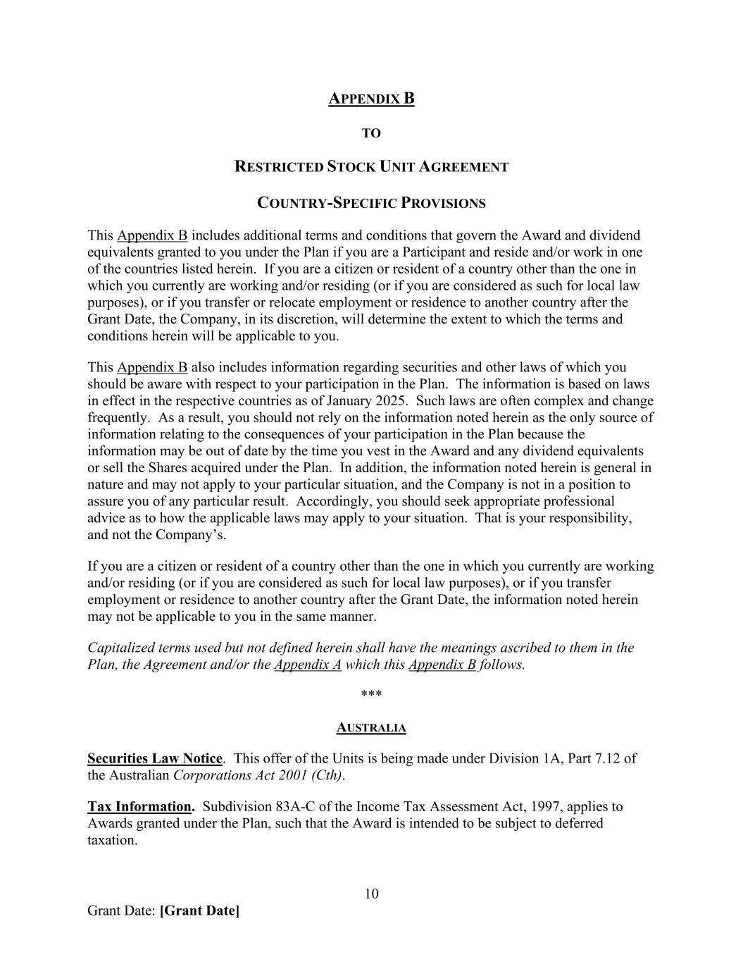 10 Grant Date: [Grant Date] APPENDIX B TO RESTRICTED STOCK UNIT AGREEMENT COUNTRY-SPECIFIC PROVISIONS This Appendix B includes additional terms and conditions that govern the Award and dividend equivalents granted to you under the Plan if you are a Participant and reside and/or work in one of the countries listed herein. If you are a citizen or resident of a country other than the one in which you currently are working and/or residing (or if you are considered as such for local law purposes), or if you transfer or relocate employment or residence to another country after the Grant Date, the Company, in its discretion, will determine the extent to which the terms and conditions herein will be applicable to you. This Appendix B also includes information regarding securities and other laws of which you should be aware with respect to your participation in the Plan. The information is based on laws in effect in the respective countries as of January 2025. Such laws are often complex and change frequently. As a result, you should not rely on the information noted herein as the only source of information relating to the consequences of your participation in the Plan because the information may be out of date by the time you vest in the Award and any dividend equivalents or sell the Shares acquired under the Plan. In addition, the information noted herein is general in nature and may not apply to your particular situation, and the Company is not in a position to assure you of any particular result. Accordingly, you should seek appropriate professional advice as to how the applicable laws may apply to your situation. That is your responsibility, and not the Company’s. If you are a citizen or resident of a country other than the one in which you currently are working and/or residing (or if you are considered as such for local law purposes), or if you transfer employment or residence to another country after the Grant Date, the information noted herein may not be applicable to you in the same manner. Capitalized terms used but not defined herein shall have the meanings ascribed to them in the Plan, the Agreement and/or the Appendix A which this Appendix B follows. *** AUSTRALIA Securities Law Notice. This offer of the Units is being made under Division 1A, Part 7.12 of the Australian Corporations Act 2001 (Cth). Tax Information. Subdivision 83A-C of the Income Tax Assessment Act, 1997, applies to Awards granted under the Plan, such that the Award is intended to be subject to deferred taxation.