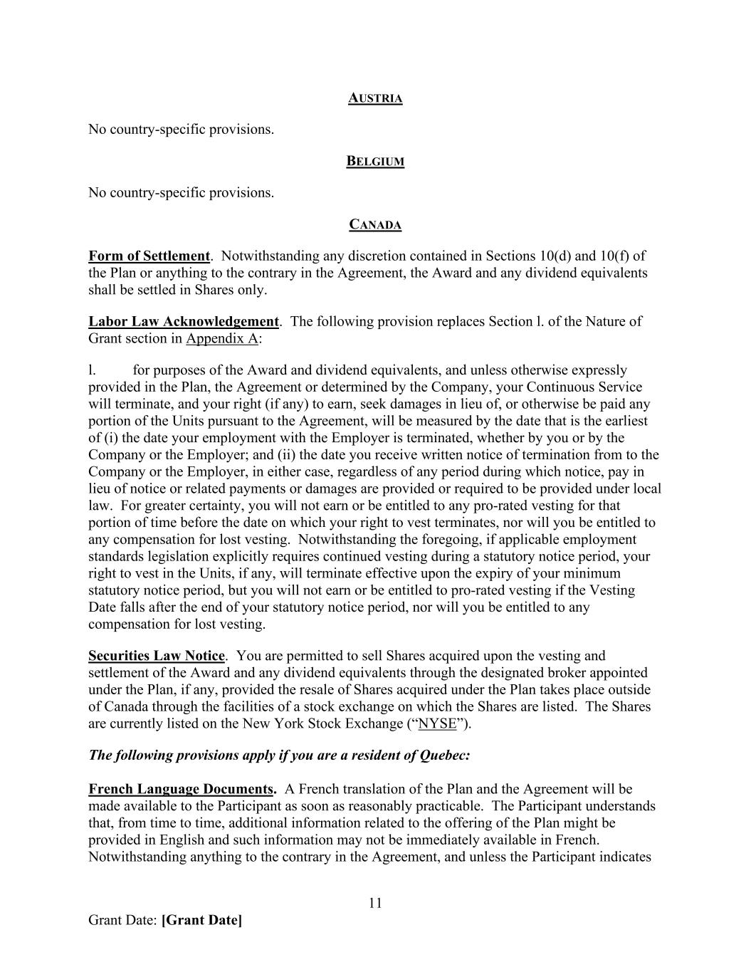 11 Grant Date: [Grant Date] AUSTRIA No country-specific provisions. BELGIUM No country-specific provisions. CANADA Form of Settlement. Notwithstanding any discretion contained in Sections 10(d) and 10(f) of the Plan or anything to the contrary in the Agreement, the Award and any dividend equivalents shall be settled in Shares only. Labor Law Acknowledgement. The following provision replaces Section l. of the Nature of Grant section in Appendix A: l. for purposes of the Award and dividend equivalents, and unless otherwise expressly provided in the Plan, the Agreement or determined by the Company, your Continuous Service will terminate, and your right (if any) to earn, seek damages in lieu of, or otherwise be paid any portion of the Units pursuant to the Agreement, will be measured by the date that is the earliest of (i) the date your employment with the Employer is terminated, whether by you or by the Company or the Employer; and (ii) the date you receive written notice of termination from to the Company or the Employer, in either case, regardless of any period during which notice, pay in lieu of notice or related payments or damages are provided or required to be provided under local law. For greater certainty, you will not earn or be entitled to any pro-rated vesting for that portion of time before the date on which your right to vest terminates, nor will you be entitled to any compensation for lost vesting. Notwithstanding the foregoing, if applicable employment standards legislation explicitly requires continued vesting during a statutory notice period, your right to vest in the Units, if any, will terminate effective upon the expiry of your minimum statutory notice period, but you will not earn or be entitled to pro-rated vesting if the Vesting Date falls after the end of your statutory notice period, nor will you be entitled to any compensation for lost vesting. Securities Law Notice. You are permitted to sell Shares acquired upon the vesting and settlement of the Award and any dividend equivalents through the designated broker appointed under the Plan, if any, provided the resale of Shares acquired under the Plan takes place outside of Canada through the facilities of a stock exchange on which the Shares are listed. The Shares are currently listed on the New York Stock Exchange (“NYSE”). The following provisions apply if you are a resident of Quebec: French Language Documents. A French translation of the Plan and the Agreement will be made available to the Participant as soon as reasonably practicable. The Participant understands that, from time to time, additional information related to the offering of the Plan might be provided in English and such information may not be immediately available in French. Notwithstanding anything to the contrary in the Agreement, and unless the Participant indicates