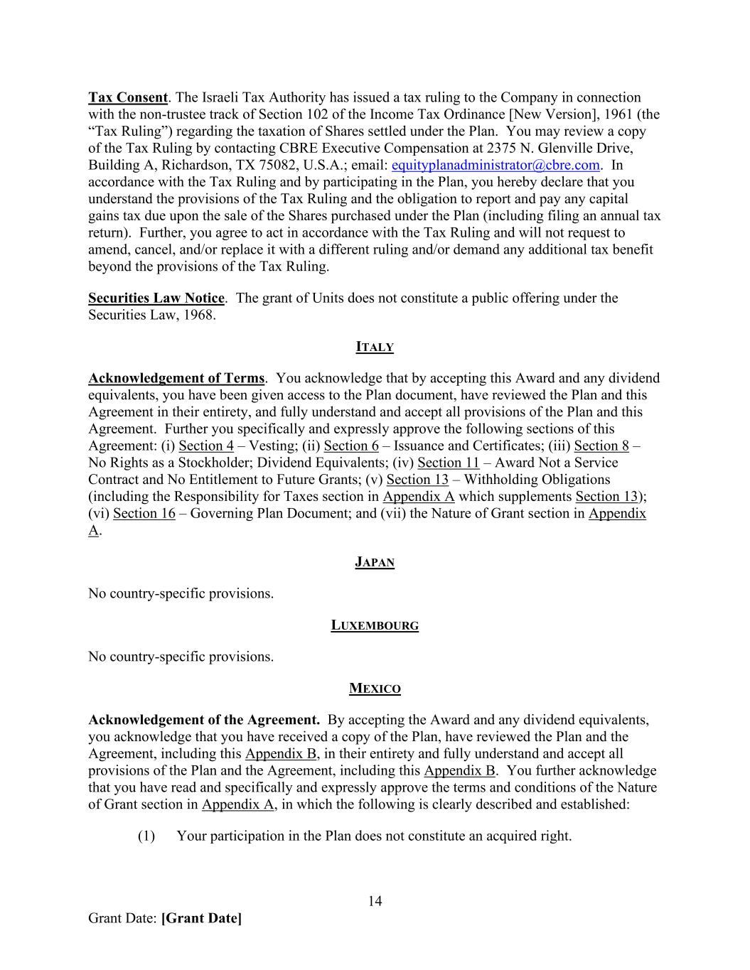 14 Grant Date: [Grant Date] Tax Consent. The Israeli Tax Authority has issued a tax ruling to the Company in connection with the non-trustee track of Section 102 of the Income Tax Ordinance [New Version], 1961 (the “Tax Ruling”) regarding the taxation of Shares settled under the Plan. You may review a copy of the Tax Ruling by contacting CBRE Executive Compensation at 2375 N. Glenville Drive, Building A, Richardson, TX 75082, U.S.A.; email: equityplanadministrator@cbre.com. In accordance with the Tax Ruling and by participating in the Plan, you hereby declare that you understand the provisions of the Tax Ruling and the obligation to report and pay any capital gains tax due upon the sale of the Shares purchased under the Plan (including filing an annual tax return). Further, you agree to act in accordance with the Tax Ruling and will not request to amend, cancel, and/or replace it with a different ruling and/or demand any additional tax benefit beyond the provisions of the Tax Ruling. Securities Law Notice. The grant of Units does not constitute a public offering under the Securities Law, 1968. ITALY Acknowledgement of Terms. You acknowledge that by accepting this Award and any dividend equivalents, you have been given access to the Plan document, have reviewed the Plan and this Agreement in their entirety, and fully understand and accept all provisions of the Plan and this Agreement. Further you specifically and expressly approve the following sections of this Agreement: (i) Section 4 – Vesting; (ii) Section 6 – Issuance and Certificates; (iii) Section 8 – No Rights as a Stockholder; Dividend Equivalents; (iv) Section 11 – Award Not a Service Contract and No Entitlement to Future Grants; (v) Section 13 – Withholding Obligations (including the Responsibility for Taxes section in Appendix A which supplements Section 13); (vi) Section 16 – Governing Plan Document; and (vii) the Nature of Grant section in Appendix A. JAPAN No country-specific provisions. LUXEMBOURG No country-specific provisions. MEXICO Acknowledgement of the Agreement. By accepting the Award and any dividend equivalents, you acknowledge that you have received a copy of the Plan, have reviewed the Plan and the Agreement, including this Appendix B, in their entirety and fully understand and accept all provisions of the Plan and the Agreement, including this Appendix B. You further acknowledge that you have read and specifically and expressly approve the terms and conditions of the Nature of Grant section in Appendix A, in which the following is clearly described and established: (1) Your participation in the Plan does not constitute an acquired right.