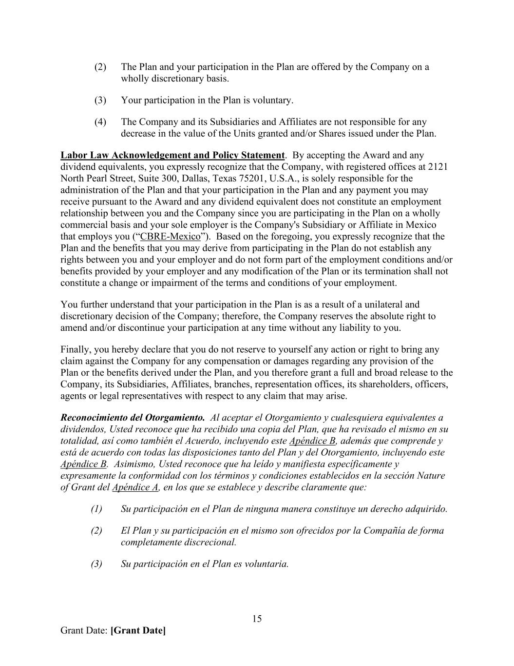 15 Grant Date: [Grant Date] (2) The Plan and your participation in the Plan are offered by the Company on a wholly discretionary basis. (3) Your participation in the Plan is voluntary. (4) The Company and its Subsidiaries and Affiliates are not responsible for any decrease in the value of the Units granted and/or Shares issued under the Plan. Labor Law Acknowledgement and Policy Statement. By accepting the Award and any dividend equivalents, you expressly recognize that the Company, with registered offices at 2121 North Pearl Street, Suite 300, Dallas, Texas 75201, U.S.A., is solely responsible for the administration of the Plan and that your participation in the Plan and any payment you may receive pursuant to the Award and any dividend equivalent does not constitute an employment relationship between you and the Company since you are participating in the Plan on a wholly commercial basis and your sole employer is the Company's Subsidiary or Affiliate in Mexico that employs you (“CBRE-Mexico”). Based on the foregoing, you expressly recognize that the Plan and the benefits that you may derive from participating in the Plan do not establish any rights between you and your employer and do not form part of the employment conditions and/or benefits provided by your employer and any modification of the Plan or its termination shall not constitute a change or impairment of the terms and conditions of your employment. You further understand that your participation in the Plan is as a result of a unilateral and discretionary decision of the Company; therefore, the Company reserves the absolute right to amend and/or discontinue your participation at any time without any liability to you. Finally, you hereby declare that you do not reserve to yourself any action or right to bring any claim against the Company for any compensation or damages regarding any provision of the Plan or the benefits derived under the Plan, and you therefore grant a full and broad release to the Company, its Subsidiaries, Affiliates, branches, representation offices, its shareholders, officers, agents or legal representatives with respect to any claim that may arise. Reconocimiento del Otorgamiento. Al aceptar el Otorgamiento y cualesquiera equivalentes a dividendos, Usted reconoce que ha recibido una copia del Plan, que ha revisado el mismo en su totalidad, así como también el Acuerdo, incluyendo este Apéndice B, además que comprende y está de acuerdo con todas las disposiciones tanto del Plan y del Otorgamiento, incluyendo este Apéndice B. Asimismo, Usted reconoce que ha leído y manifiesta específicamente y expresamente la conformidad con los términos y condiciones establecidos en la sección Nature of Grant del Apéndice A, en los que se establece y describe claramente que: (1) Su participación en el Plan de ninguna manera constituye un derecho adquirido. (2) El Plan y su participación en el mismo son ofrecidos por la Compañía de forma completamente discrecional. (3) Su participación en el Plan es voluntaria.