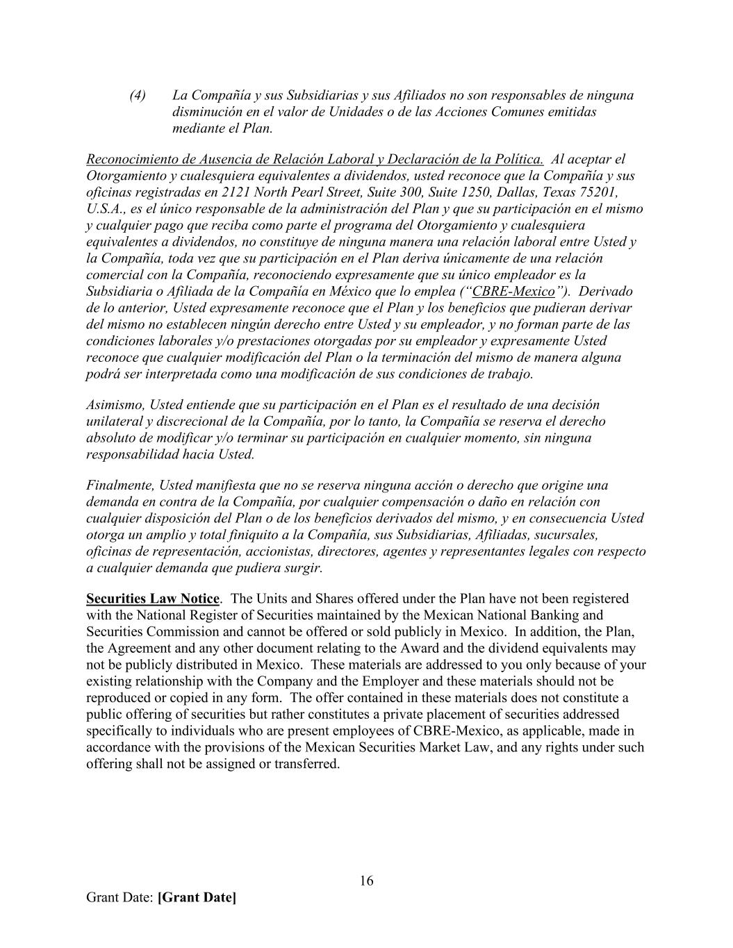 16 Grant Date: [Grant Date] (4) La Compañía y sus Subsidiarias y sus Afiliados no son responsables de ninguna disminución en el valor de Unidades o de las Acciones Comunes emitidas mediante el Plan. Reconocimiento de Ausencia de Relación Laboral y Declaración de la Política. Al aceptar el Otorgamiento y cualesquiera equivalentes a dividendos, usted reconoce que la Compañía y sus oficinas registradas en 2121 North Pearl Street, Suite 300, Suite 1250, Dallas, Texas 75201, U.S.A., es el único responsable de la administración del Plan y que su participación en el mismo y cualquier pago que reciba como parte el programa del Otorgamiento y cualesquiera equivalentes a dividendos, no constituye de ninguna manera una relación laboral entre Usted y la Compañía, toda vez que su participación en el Plan deriva únicamente de una relación comercial con la Compañía, reconociendo expresamente que su único empleador es la Subsidiaria o Afiliada de la Compañía en México que lo emplea (“CBRE-Mexico”). Derivado de lo anterior, Usted expresamente reconoce que el Plan y los beneficios que pudieran derivar del mismo no establecen ningún derecho entre Usted y su empleador, y no forman parte de las condiciones laborales y/o prestaciones otorgadas por su empleador y expresamente Usted reconoce que cualquier modificación del Plan o la terminación del mismo de manera alguna podrá ser interpretada como una modificación de sus condiciones de trabajo. Asimismo, Usted entiende que su participación en el Plan es el resultado de una decisión unilateral y discrecional de la Compañía, por lo tanto, la Compañía se reserva el derecho absoluto de modificar y/o terminar su participación en cualquier momento, sin ninguna responsabilidad hacia Usted. Finalmente, Usted manifiesta que no se reserva ninguna acción o derecho que origine una demanda en contra de la Compañía, por cualquier compensación o daño en relación con cualquier disposición del Plan o de los beneficios derivados del mismo, y en consecuencia Usted otorga un amplio y total finiquito a la Compañía, sus Subsidiarias, Afiliadas, sucursales, oficinas de representación, accionistas, directores, agentes y representantes legales con respecto a cualquier demanda que pudiera surgir. Securities Law Notice. The Units and Shares offered under the Plan have not been registered with the National Register of Securities maintained by the Mexican National Banking and Securities Commission and cannot be offered or sold publicly in Mexico. In addition, the Plan, the Agreement and any other document relating to the Award and the dividend equivalents may not be publicly distributed in Mexico. These materials are addressed to you only because of your existing relationship with the Company and the Employer and these materials should not be reproduced or copied in any form. The offer contained in these materials does not constitute a public offering of securities but rather constitutes a private placement of securities addressed specifically to individuals who are present employees of CBRE-Mexico, as applicable, made in accordance with the provisions of the Mexican Securities Market Law, and any rights under such offering shall not be assigned or transferred.