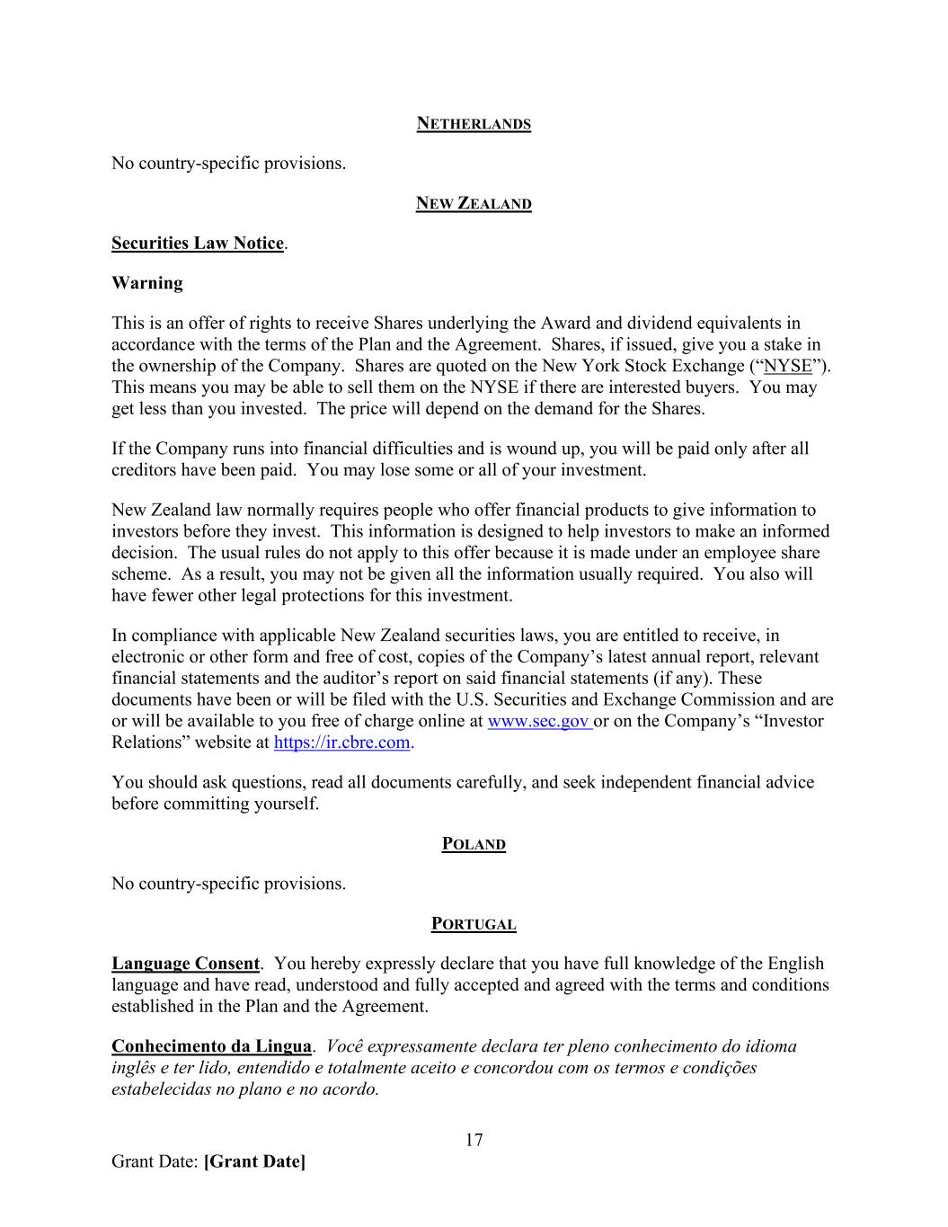 17 Grant Date: [Grant Date] NETHERLANDS No country-specific provisions. NEW ZEALAND Securities Law Notice. Warning This is an offer of rights to receive Shares underlying the Award and dividend equivalents in accordance with the terms of the Plan and the Agreement. Shares, if issued, give you a stake in the ownership of the Company. Shares are quoted on the New York Stock Exchange (“NYSE”). This means you may be able to sell them on the NYSE if there are interested buyers. You may get less than you invested. The price will depend on the demand for the Shares. If the Company runs into financial difficulties and is wound up, you will be paid only after all creditors have been paid. You may lose some or all of your investment. New Zealand law normally requires people who offer financial products to give information to investors before they invest. This information is designed to help investors to make an informed decision. The usual rules do not apply to this offer because it is made under an employee share scheme. As a result, you may not be given all the information usually required. You also will have fewer other legal protections for this investment. In compliance with applicable New Zealand securities laws, you are entitled to receive, in electronic or other form and free of cost, copies of the Company’s latest annual report, relevant financial statements and the auditor’s report on said financial statements (if any). These documents have been or will be filed with the U.S. Securities and Exchange Commission and are or will be available to you free of charge online at www.sec.gov or on the Company’s “Investor Relations” website at https://ir.cbre.com. You should ask questions, read all documents carefully, and seek independent financial advice before committing yourself. POLAND No country-specific provisions. PORTUGAL Language Consent. You hereby expressly declare that you have full knowledge of the English language and have read, understood and fully accepted and agreed with the terms and conditions established in the Plan and the Agreement. Conhecimento da Lingua. Você expressamente declara ter pleno conhecimento do idioma inglês e ter lido, entendido e totalmente aceito e concordou com os termos e condições estabelecidas no plano e no acordo.