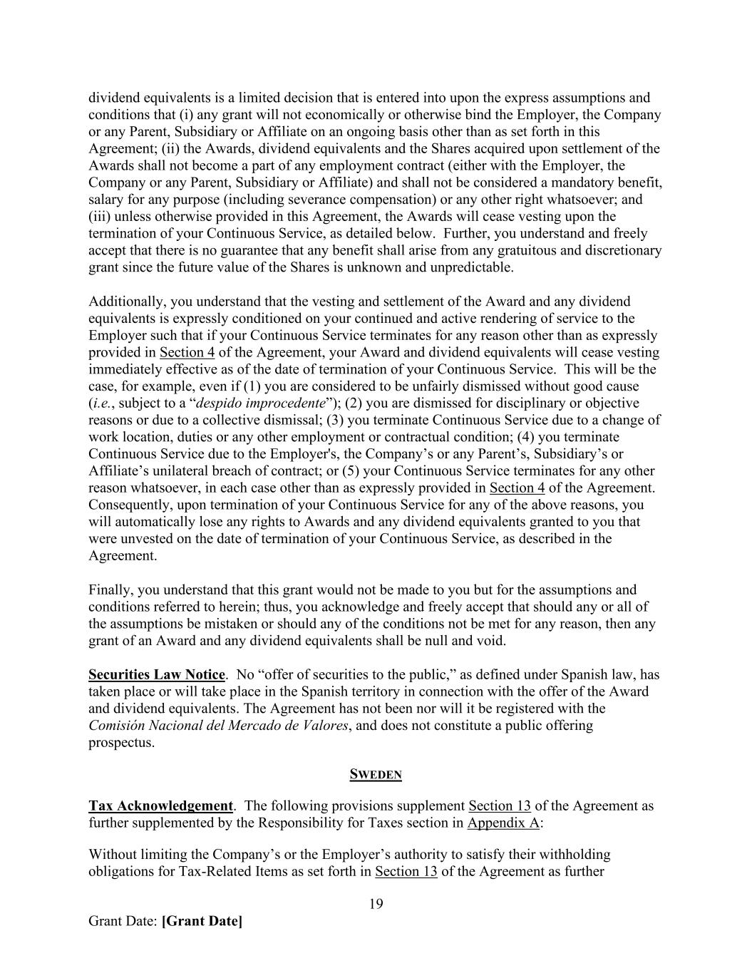 19 Grant Date: [Grant Date] dividend equivalents is a limited decision that is entered into upon the express assumptions and conditions that (i) any grant will not economically or otherwise bind the Employer, the Company or any Parent, Subsidiary or Affiliate on an ongoing basis other than as set forth in this Agreement; (ii) the Awards, dividend equivalents and the Shares acquired upon settlement of the Awards shall not become a part of any employment contract (either with the Employer, the Company or any Parent, Subsidiary or Affiliate) and shall not be considered a mandatory benefit, salary for any purpose (including severance compensation) or any other right whatsoever; and (iii) unless otherwise provided in this Agreement, the Awards will cease vesting upon the termination of your Continuous Service, as detailed below. Further, you understand and freely accept that there is no guarantee that any benefit shall arise from any gratuitous and discretionary grant since the future value of the Shares is unknown and unpredictable. Additionally, you understand that the vesting and settlement of the Award and any dividend equivalents is expressly conditioned on your continued and active rendering of service to the Employer such that if your Continuous Service terminates for any reason other than as expressly provided in Section 4 of the Agreement, your Award and dividend equivalents will cease vesting immediately effective as of the date of termination of your Continuous Service. This will be the case, for example, even if (1) you are considered to be unfairly dismissed without good cause (i.e., subject to a “despido improcedente”); (2) you are dismissed for disciplinary or objective reasons or due to a collective dismissal; (3) you terminate Continuous Service due to a change of work location, duties or any other employment or contractual condition; (4) you terminate Continuous Service due to the Employer's, the Company’s or any Parent’s, Subsidiary’s or Affiliate’s unilateral breach of contract; or (5) your Continuous Service terminates for any other reason whatsoever, in each case other than as expressly provided in Section 4 of the Agreement. Consequently, upon termination of your Continuous Service for any of the above reasons, you will automatically lose any rights to Awards and any dividend equivalents granted to you that were unvested on the date of termination of your Continuous Service, as described in the Agreement. Finally, you understand that this grant would not be made to you but for the assumptions and conditions referred to herein; thus, you acknowledge and freely accept that should any or all of the assumptions be mistaken or should any of the conditions not be met for any reason, then any grant of an Award and any dividend equivalents shall be null and void. Securities Law Notice. No “offer of securities to the public,” as defined under Spanish law, has taken place or will take place in the Spanish territory in connection with the offer of the Award and dividend equivalents. The Agreement has not been nor will it be registered with the Comisión Nacional del Mercado de Valores, and does not constitute a public offering prospectus. SWEDEN Tax Acknowledgement. The following provisions supplement Section 13 of the Agreement as further supplemented by the Responsibility for Taxes section in Appendix A: Without limiting the Company’s or the Employer’s authority to satisfy their withholding obligations for Tax-Related Items as set forth in Section 13 of the Agreement as further