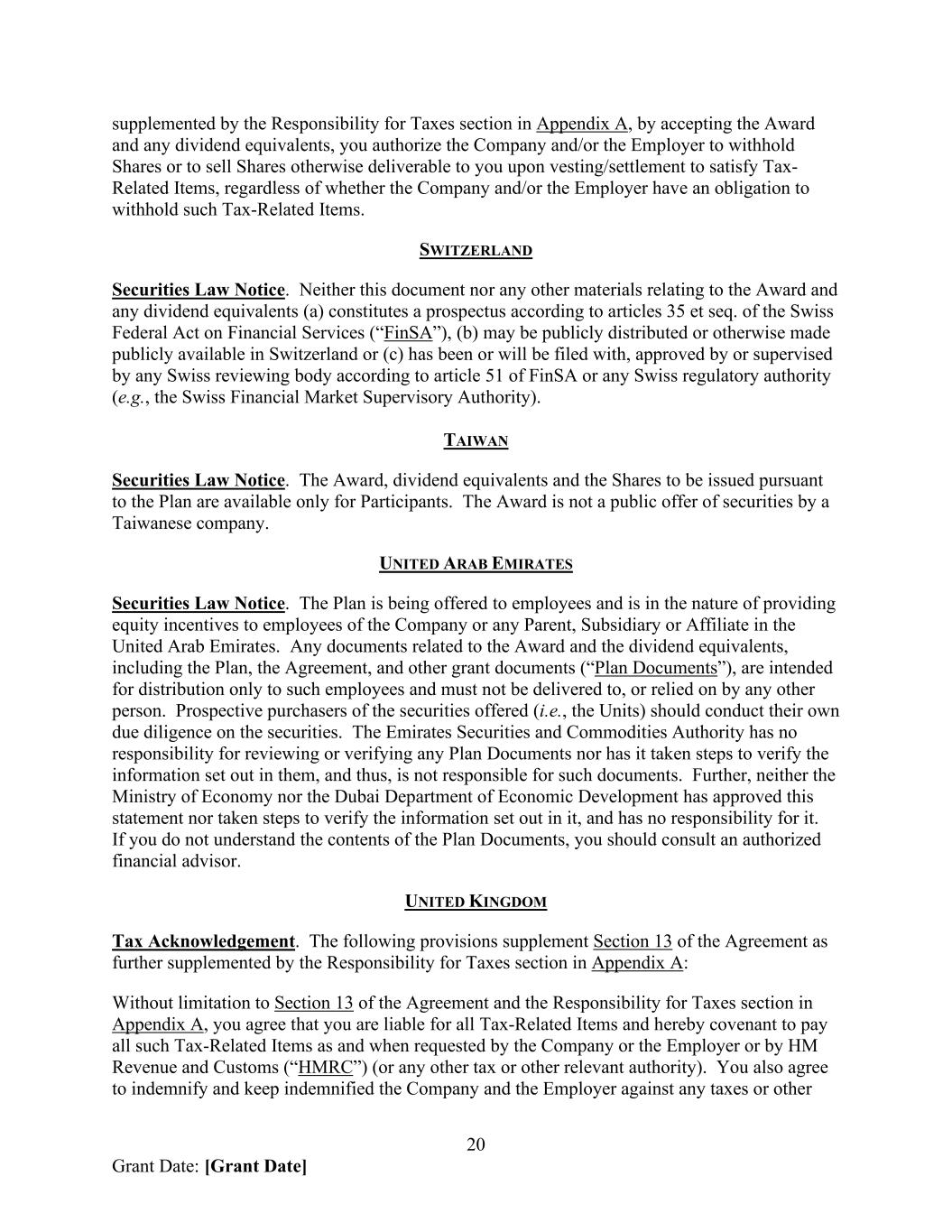 20 Grant Date: [Grant Date] supplemented by the Responsibility for Taxes section in Appendix A, by accepting the Award and any dividend equivalents, you authorize the Company and/or the Employer to withhold Shares or to sell Shares otherwise deliverable to you upon vesting/settlement to satisfy Tax- Related Items, regardless of whether the Company and/or the Employer have an obligation to withhold such Tax-Related Items. SWITZERLAND Securities Law Notice. Neither this document nor any other materials relating to the Award and any dividend equivalents (a) constitutes a prospectus according to articles 35 et seq. of the Swiss Federal Act on Financial Services (“FinSA”), (b) may be publicly distributed or otherwise made publicly available in Switzerland or (c) has been or will be filed with, approved by or supervised by any Swiss reviewing body according to article 51 of FinSA or any Swiss regulatory authority (e.g., the Swiss Financial Market Supervisory Authority). TAIWAN Securities Law Notice. The Award, dividend equivalents and the Shares to be issued pursuant to the Plan are available only for Participants. The Award is not a public offer of securities by a Taiwanese company. UNITED ARAB EMIRATES Securities Law Notice. The Plan is being offered to employees and is in the nature of providing equity incentives to employees of the Company or any Parent, Subsidiary or Affiliate in the United Arab Emirates. Any documents related to the Award and the dividend equivalents, including the Plan, the Agreement, and other grant documents (“Plan Documents”), are intended for distribution only to such employees and must not be delivered to, or relied on by any other person. Prospective purchasers of the securities offered (i.e., the Units) should conduct their own due diligence on the securities. The Emirates Securities and Commodities Authority has no responsibility for reviewing or verifying any Plan Documents nor has it taken steps to verify the information set out in them, and thus, is not responsible for such documents. Further, neither the Ministry of Economy nor the Dubai Department of Economic Development has approved this statement nor taken steps to verify the information set out in it, and has no responsibility for it. If you do not understand the contents of the Plan Documents, you should consult an authorized financial advisor. UNITED KINGDOM Tax Acknowledgement. The following provisions supplement Section 13 of the Agreement as further supplemented by the Responsibility for Taxes section in Appendix A: Without limitation to Section 13 of the Agreement and the Responsibility for Taxes section in Appendix A, you agree that you are liable for all Tax-Related Items and hereby covenant to pay all such Tax-Related Items as and when requested by the Company or the Employer or by HM Revenue and Customs (“HMRC”) (or any other tax or other relevant authority). You also agree to indemnify and keep indemnified the Company and the Employer against any taxes or other