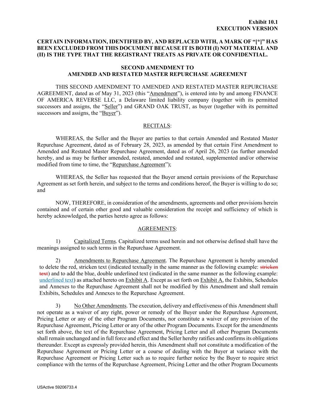 Exhibit 10.1 EXECUTION VERSION CERTAIN INFORMATION, IDENTIFIED BY, AND REPLACED WITH, A MARK OF “[*]” HAS BEEN EXCLUDED FROM THIS DOCUMENT BECAUSE IT IS BOTH (I) NOT MATERIAL AND (II) IS THE TYPE THAT THE REGISTRANT TREATS AS PRIVATE OR CONFIDENTIAL. USActive 59206733.4 SECOND AMENDMENT TO AMENDED AND RESTATED MASTER REPURCHASE AGREEMENT THIS SECOND AMENDMENT TO AMENDED AND RESTATED MASTER REPURCHASE AGREEMENT, dated as of May 31, 2023 (this “Amendment”), is entered into by and among FINANCE OF AMERICA REVERSE LLC, a Delaware limited liability company (together with its permitted successors and assigns, the “Seller”) and GRAND OAK TRUST, as buyer (together with its permitted successors and assigns, the “Buyer”). RECITALS: WHEREAS, the Seller and the Buyer are parties to that certain Amended and Restated Master Repurchase Agreement, dated as of February 28, 2023, as amended by that certain First Amendment to Amended and Restated Master Repurchase Agreement, dated as of April 26, 2023 (as further amended hereby, and as may be further amended, restated, amended and restated, supplemented and/or otherwise modified from time to time, the “Repurchase Agreement”); WHEREAS, the Seller has requested that the Buyer amend certain provisions of the Repurchase Agreement as set forth herein, and subject to the terms and conditions hereof, the Buyer is willing to do so; and NOW, THEREFORE, in consideration of the amendments, agreements and other provisions herein contained and of certain other good and valuable consideration the receipt and sufficiency of which is hereby acknowledged, the parties hereto agree as follows: AGREEMENTS: 1) Capitalized Terms. Capitalized terms used herein and not otherwise defined shall have the meanings assigned to such terms in the Repurchase Agreement. 2) Amendments to Repurchase Agreement. The Repurchase Agreement is hereby amended to delete the red, stricken text (indicated textually in the same manner as the following example: stricken text) and to add the blue, double underlined text (indicated in the same manner as the following example: underlined text) as attached hereto on Exhibit A. Except as set forth on Exhibit A, the Exhibits, Schedules and Annexes to the Repurchase Agreement shall not be modified by this Amendment and shall remain Exhibits, Schedules and Annexes to the Repurchase Agreement. 3) No Other Amendments. The execution, delivery and effectiveness of this Amendment shall not operate as a waiver of any right, power or remedy of the Buyer under the Repurchase Agreement, Pricing Letter or any of the other Program Documents, nor constitute a waiver of any provision of the Repurchase Agreement, Pricing Letter or any of the other Program Documents. Except for the amendments set forth above, the text of the Repurchase Agreement, Pricing Letter and all other Program Documents shall remain unchanged and in full force and effect and the Seller hereby ratifies and confirms its obligations thereunder. Except as expressly provided herein, this Amendment shall not constitute a modification of the Repurchase Agreement or Pricing Letter or a course of dealing with the Buyer at variance with the Repurchase Agreement or Pricing Letter such as to require further notice by the Buyer to require strict compliance with the terms of the Repurchase Agreement, Pricing Letter and the other Program Documents