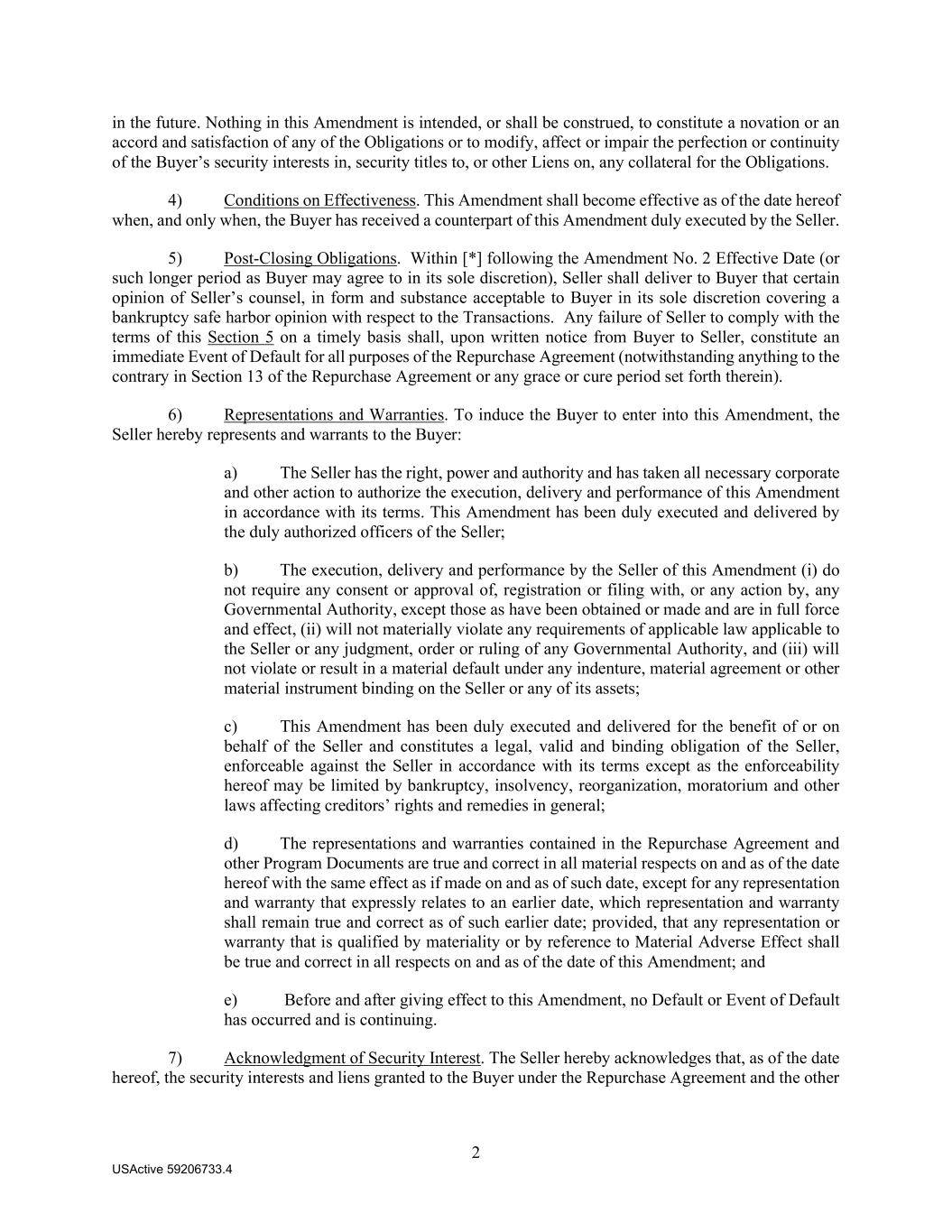 2 USActive 59206733.4 in the future. Nothing in this Amendment is intended, or shall be construed, to constitute a novation or an accord and satisfaction of any of the Obligations or to modify, affect or impair the perfection or continuity of the Buyer’s security interests in, security titles to, or other Liens on, any collateral for the Obligations. 4) Conditions on Effectiveness. This Amendment shall become effective as of the date hereof when, and only when, the Buyer has received a counterpart of this Amendment duly executed by the Seller. 5) Post-Closing Obligations. Within [*] following the Amendment No. 2 Effective Date (or such longer period as Buyer may agree to in its sole discretion), Seller shall deliver to Buyer that certain opinion of Seller’s counsel, in form and substance acceptable to Buyer in its sole discretion covering a bankruptcy safe harbor opinion with respect to the Transactions. Any failure of Seller to comply with the terms of this Section 5 on a timely basis shall, upon written notice from Buyer to Seller, constitute an immediate Event of Default for all purposes of the Repurchase Agreement (notwithstanding anything to the contrary in Section 13 of the Repurchase Agreement or any grace or cure period set forth therein). 6) Representations and Warranties. To induce the Buyer to enter into this Amendment, the Seller hereby represents and warrants to the Buyer: a) The Seller has the right, power and authority and has taken all necessary corporate and other action to authorize the execution, delivery and performance of this Amendment in accordance with its terms. This Amendment has been duly executed and delivered by the duly authorized officers of the Seller; b) The execution, delivery and performance by the Seller of this Amendment (i) do not require any consent or approval of, registration or filing with, or any action by, any Governmental Authority, except those as have been obtained or made and are in full force and effect, (ii) will not materially violate any requirements of applicable law applicable to the Seller or any judgment, order or ruling of any Governmental Authority, and (iii) will not violate or result in a material default under any indenture, material agreement or other material instrument binding on the Seller or any of its assets; c) This Amendment has been duly executed and delivered for the benefit of or on behalf of the Seller and constitutes a legal, valid and binding obligation of the Seller, enforceable against the Seller in accordance with its terms except as the enforceability hereof may be limited by bankruptcy, insolvency, reorganization, moratorium and other laws affecting creditors’ rights and remedies in general; d) The representations and warranties contained in the Repurchase Agreement and other Program Documents are true and correct in all material respects on and as of the date hereof with the same effect as if made on and as of such date, except for any representation and warranty that expressly relates to an earlier date, which representation and warranty shall remain true and correct as of such earlier date; provided, that any representation or warranty that is qualified by materiality or by reference to Material Adverse Effect shall be true and correct in all respects on and as of the date of this Amendment; and e) Before and after giving effect to this Amendment, no Default or Event of Default has occurred and is continuing. 7) Acknowledgment of Security Interest. The Seller hereby acknowledges that, as of the date hereof, the security interests and liens granted to the Buyer under the Repurchase Agreement and the other