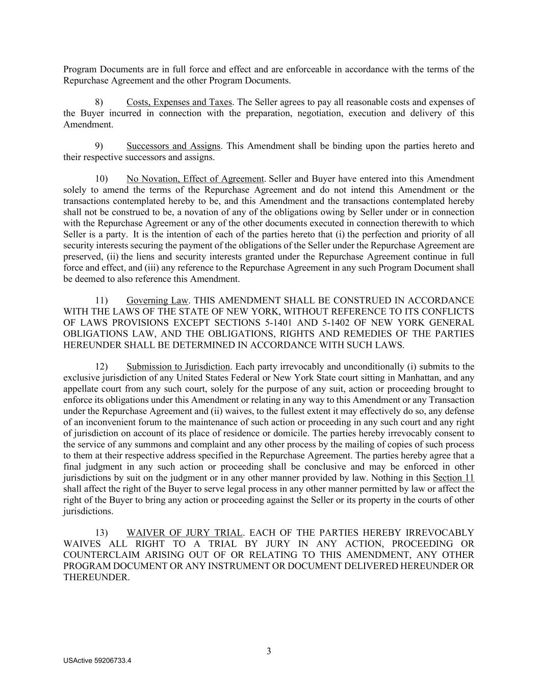 3 USActive 59206733.4 Program Documents are in full force and effect and are enforceable in accordance with the terms of the Repurchase Agreement and the other Program Documents. 8) Costs, Expenses and Taxes. The Seller agrees to pay all reasonable costs and expenses of the Buyer incurred in connection with the preparation, negotiation, execution and delivery of this Amendment. 9) Successors and Assigns. This Amendment shall be binding upon the parties hereto and their respective successors and assigns. 10) No Novation, Effect of Agreement. Seller and Buyer have entered into this Amendment solely to amend the terms of the Repurchase Agreement and do not intend this Amendment or the transactions contemplated hereby to be, and this Amendment and the transactions contemplated hereby shall not be construed to be, a novation of any of the obligations owing by Seller under or in connection with the Repurchase Agreement or any of the other documents executed in connection therewith to which Seller is a party. It is the intention of each of the parties hereto that (i) the perfection and priority of all security interests securing the payment of the obligations of the Seller under the Repurchase Agreement are preserved, (ii) the liens and security interests granted under the Repurchase Agreement continue in full force and effect, and (iii) any reference to the Repurchase Agreement in any such Program Document shall be deemed to also reference this Amendment. 11) Governing Law. THIS AMENDMENT SHALL BE CONSTRUED IN ACCORDANCE WITH THE LAWS OF THE STATE OF NEW YORK, WITHOUT REFERENCE TO ITS CONFLICTS OF LAWS PROVISIONS EXCEPT SECTIONS 5-1401 AND 5-1402 OF NEW YORK GENERAL OBLIGATIONS LAW, AND THE OBLIGATIONS, RIGHTS AND REMEDIES OF THE PARTIES HEREUNDER SHALL BE DETERMINED IN ACCORDANCE WITH SUCH LAWS. 12) Submission to Jurisdiction. Each party irrevocably and unconditionally (i) submits to the exclusive jurisdiction of any United States Federal or New York State court sitting in Manhattan, and any appellate court from any such court, solely for the purpose of any suit, action or proceeding brought to enforce its obligations under this Amendment or relating in any way to this Amendment or any Transaction under the Repurchase Agreement and (ii) waives, to the fullest extent it may effectively do so, any defense of an inconvenient forum to the maintenance of such action or proceeding in any such court and any right of jurisdiction on account of its place of residence or domicile. The parties hereby irrevocably consent to the service of any summons and complaint and any other process by the mailing of copies of such process to them at their respective address specified in the Repurchase Agreement. The parties hereby agree that a final judgment in any such action or proceeding shall be conclusive and may be enforced in other jurisdictions by suit on the judgment or in any other manner provided by law. Nothing in this Section 11 shall affect the right of the Buyer to serve legal process in any other manner permitted by law or affect the right of the Buyer to bring any action or proceeding against the Seller or its property in the courts of other jurisdictions. 13) WAIVER OF JURY TRIAL. EACH OF THE PARTIES HEREBY IRREVOCABLY WAIVES ALL RIGHT TO A TRIAL BY JURY IN ANY ACTION, PROCEEDING OR COUNTERCLAIM ARISING OUT OF OR RELATING TO THIS AMENDMENT, ANY OTHER PROGRAM DOCUMENT OR ANY INSTRUMENT OR DOCUMENT DELIVERED HEREUNDER OR THEREUNDER.