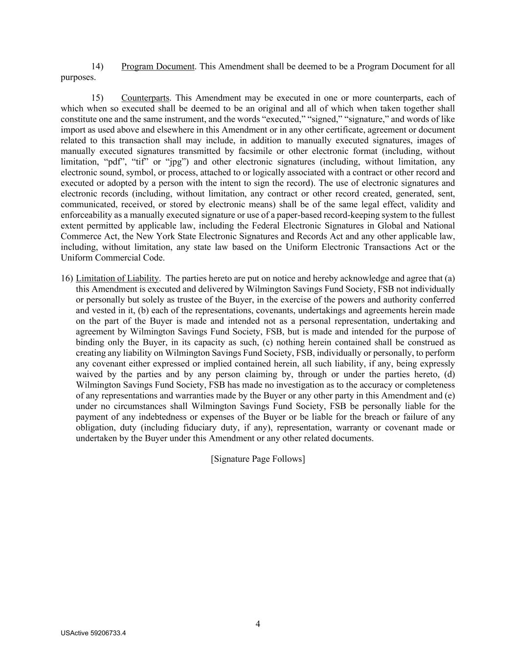 4 USActive 59206733.4 14) Program Document. This Amendment shall be deemed to be a Program Document for all purposes. 15) Counterparts. This Amendment may be executed in one or more counterparts, each of which when so executed shall be deemed to be an original and all of which when taken together shall constitute one and the same instrument, and the words “executed,” “signed,” “signature,” and words of like import as used above and elsewhere in this Amendment or in any other certificate, agreement or document related to this transaction shall may include, in addition to manually executed signatures, images of manually executed signatures transmitted by facsimile or other electronic format (including, without limitation, “pdf”, “tif” or “jpg”) and other electronic signatures (including, without limitation, any electronic sound, symbol, or process, attached to or logically associated with a contract or other record and executed or adopted by a person with the intent to sign the record). The use of electronic signatures and electronic records (including, without limitation, any contract or other record created, generated, sent, communicated, received, or stored by electronic means) shall be of the same legal effect, validity and enforceability as a manually executed signature or use of a paper-based record-keeping system to the fullest extent permitted by applicable law, including the Federal Electronic Signatures in Global and National Commerce Act, the New York State Electronic Signatures and Records Act and any other applicable law, including, without limitation, any state law based on the Uniform Electronic Transactions Act or the Uniform Commercial Code. 16) Limitation of Liability. The parties hereto are put on notice and hereby acknowledge and agree that (a) this Amendment is executed and delivered by Wilmington Savings Fund Society, FSB not individually or personally but solely as trustee of the Buyer, in the exercise of the powers and authority conferred and vested in it, (b) each of the representations, covenants, undertakings and agreements herein made on the part of the Buyer is made and intended not as a personal representation, undertaking and agreement by Wilmington Savings Fund Society, FSB, but is made and intended for the purpose of binding only the Buyer, in its capacity as such, (c) nothing herein contained shall be construed as creating any liability on Wilmington Savings Fund Society, FSB, individually or personally, to perform any covenant either expressed or implied contained herein, all such liability, if any, being expressly waived by the parties and by any person claiming by, through or under the parties hereto, (d) Wilmington Savings Fund Society, FSB has made no investigation as to the accuracy or completeness of any representations and warranties made by the Buyer or any other party in this Amendment and (e) under no circumstances shall Wilmington Savings Fund Society, FSB be personally liable for the payment of any indebtedness or expenses of the Buyer or be liable for the breach or failure of any obligation, duty (including fiduciary duty, if any), representation, warranty or covenant made or undertaken by the Buyer under this Amendment or any other related documents. [Signature Page Follows]