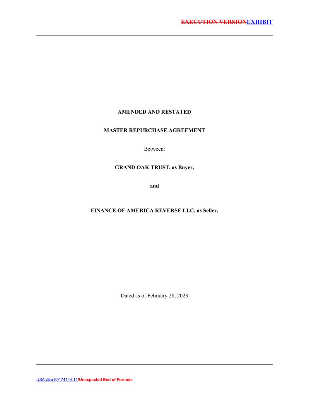 EXECUTION VERSIONEXHIBIT USActive 59174144.11!Unexpected End of Formula AMENDED AND RESTATED MASTER REPURCHASE AGREEMENT Between: GRAND OAK TRUST, as Buyer, and FINANCE OF AMERICA REVERSE LLC, as Seller, Dated as of February 28, 2023
