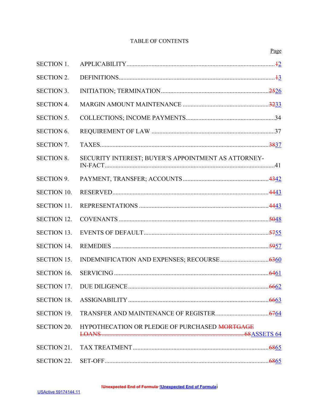 !Unexpected End of Formula !Unexpected End of Formulai USActive 59174144.11 TABLE OF CONTENTS Page SECTION 1. APPLICABILITY ...............................................................................................12 SECTION 2. DEFINITIONS....................................................................................................13 SECTION 3. INITIATION; TERMINATION .....................................................................2526 SECTION 4. MARGIN AMOUNT MAINTENANCE .......................................................3233 SECTION 5. COLLECTIONS; INCOME PAYMENTS .........................................................34 SECTION 6. REQUIREMENT OF LAW ...............................................................................37 SECTION 7. TAXES............................................................................................................3837 SECTION 8. SECURITY INTEREST; BUYER’S APPOINTMENT AS ATTORNEY- IN-FACT .............................................................................................................41 SECTION 9. PAYMENT, TRANSFER; ACCOUNTS .......................................................4342 SECTION 10. RESERVED ....................................................................................................4443 SECTION 11. REPRESENTATIONS ...................................................................................4443 SECTION 12. COVENANTS ................................................................................................5048 SECTION 13. EVENTS OF DEFAULT ................................................................................5755 SECTION 14. REMEDIES ....................................................................................................5957 SECTION 15. INDEMNIFICATION AND EXPENSES; RECOURSE ...............................6360 SECTION 16. SERVICING ...................................................................................................6461 SECTION 17. DUE DILIGENCE ..........................................................................................6662 SECTION 18. ASSIGNABILITY ..........................................................................................6663 SECTION 19. TRANSFER AND MAINTENANCE OF REGISTER. .................................6764 SECTION 20. HYPOTHECATION OR PLEDGE OF PURCHASED MORTGAGE LOANS ........................................................................................... 68ASSETS 64 SECTION 21. TAX TREATMENT .......................................................................................6865 SECTION 22. SET-OFF .........................................................................................................6865