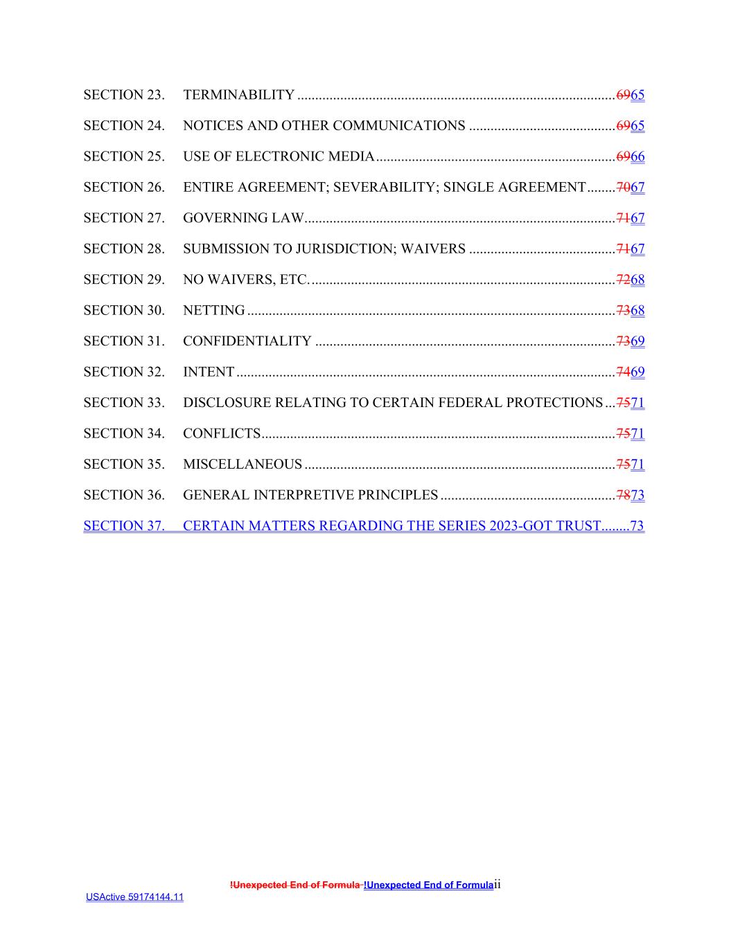 !Unexpected End of Formula !Unexpected End of Formulaii USActive 59174144.11 SECTION 23. TERMINABILITY .........................................................................................6965 SECTION 24. NOTICES AND OTHER COMMUNICATIONS .........................................6965 SECTION 25. USE OF ELECTRONIC MEDIA ...................................................................6966 SECTION 26. ENTIRE AGREEMENT; SEVERABILITY; SINGLE AGREEMENT ........7067 SECTION 27. GOVERNING LAW.......................................................................................7167 SECTION 28. SUBMISSION TO JURISDICTION; WAIVERS .........................................7167 SECTION 29. NO WAIVERS, ETC. .....................................................................................7268 SECTION 30. NETTING .......................................................................................................7368 SECTION 31. CONFIDENTIALITY ....................................................................................7369 SECTION 32. INTENT ..........................................................................................................7469 SECTION 33. DISCLOSURE RELATING TO CERTAIN FEDERAL PROTECTIONS ...7571 SECTION 34. CONFLICTS ...................................................................................................7571 SECTION 35. MISCELLANEOUS .......................................................................................7571 SECTION 36. GENERAL INTERPRETIVE PRINCIPLES .................................................7873 SECTION 37. CERTAIN MATTERS REGARDING THE SERIES 2023-GOT TRUST........73