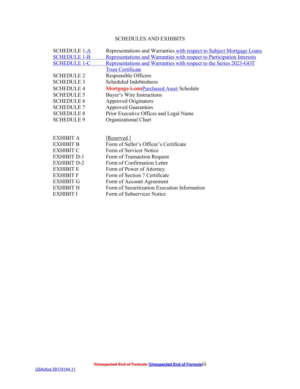 !Unexpected End of Formula !Unexpected End of Formulaiii USActive 59174144.11 SCHEDULES AND EXHIBITS SCHEDULE 1-A Representations and Warranties with respect to Subject Mortgage Loans SCHEDULE 1-B Representations and Warranties with respect to Participation Interests SCHEDULE 1-C Representations and Warranties with respect to the Series 2023-GOT Trust Certificate SCHEDULE 2 Responsible Officers SCHEDULE 3 Scheduled Indebtedness SCHEDULE 4 Mortgage LoanPurchased Asset Schedule SCHEDULE 5 Buyer’s Wire Instructions SCHEDULE 6 Approved Originators SCHEDULE 7 Approved Guarantees SCHEDULE 8 Prior Executive Offices and Legal Name SCHEDULE 9 Organizational Chart EXHIBIT A [Reserved.] EXHIBIT B Form of Seller’s Officer’s Certificate EXHIBIT C Form of Servicer Notice EXHIBIT D-1 Form of Transaction Request EXHIBIT D-2 Form of Confirmation Letter EXHIBIT E Form of Power of Attorney EXHIBIT F Form of Section 7 Certificate EXHIBIT G Form of Account Agreement EXHIBIT H Form of Securitization Execution Information EXHIBIT I Form of Subservicer Notice